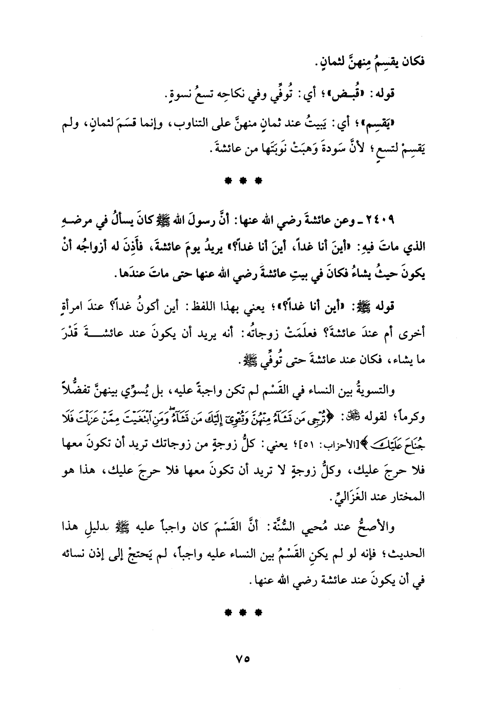 والأصحُّ عند مُحيي السُّنَّة: أنَّ القَسْمَ كان واجبًا عليه - صلى الله عليه وسلم - بدليلِ هذا الحديث؛ فإنه لو لم يكنِ القَسْمُ بين النساء عليه واجبًا، لم يَحتجْ إلى إذن نسائه في أن يكونَ عند عائشة رضي الله عنها.