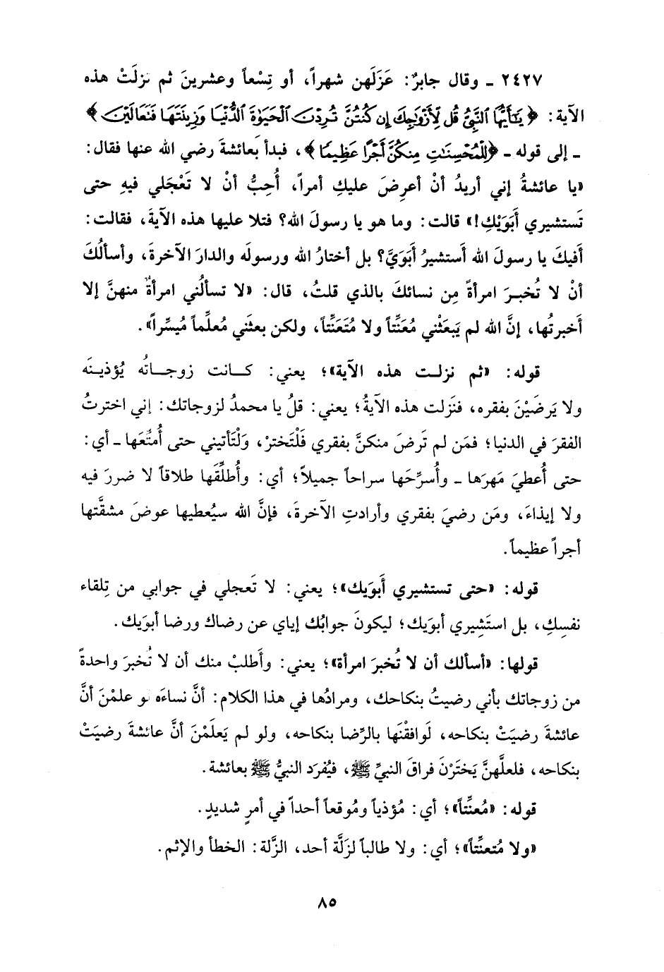 2427 - وقال جابرٌ: عَزَلَهن شهرًا، أو تِسْعًا وعشرينَ ثم نزلَتْ هذه الآية: {يَاأَيُّهَا النَّبِيُّ قُلْ لِأَزْوَاجِكَ إِنْ كُنْتُنَّ تُرِدْنَ الْحَيَاةَ الدُّنْيَا وَزِينَتَهَا فَتَعَالَيْنَ} - إلى قوله - {فَإِنَّ اللَّهَ أَعَدَّ لِلْمُحْسِنَاتِ مِنْكُنَّ أَجْرًا عَظِيمًا}، فبدأ بعائشةَ رضي الله عنها فقال: "يا عائشةُ إني أريدُ أنْ أعرِضَ عليكِ أمرًا، أُحِبُّ أنْ لا تَعْجَلي فيهِ حتى تَستشيري أَبَوَيْكِ! " قالت: وما هو يا رسولَ الله؟ فتلا عليها هذه الآيةَ، فقالت: أَفيكَ يا رسولَ الله أَستشيرُ أَبَوَيَّ؟ بل أختارُ الله ورسولَه والدارَ الآخرةَ، وأسألُكَ أنْ لا تُخبرَ امرأةً مِن نسائكَ بالذي قلتُ، قال: "لا تسألُني امرأةٌ منهنَّ إلا أَخبرتُها، إن الله لم يبعَثني مُعَنِّتًا ولا مُتَعَنِّتًا، ولكن بعثَني مُعلِّمًا مُيسِّرًا"،
