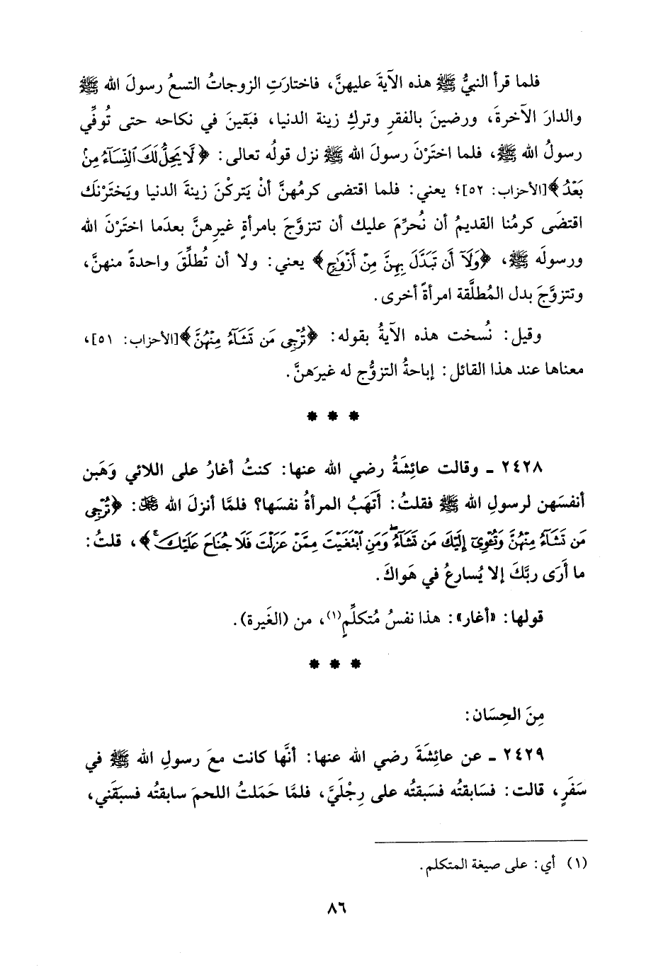 2428 - وقالت عائِشَةُ رضي الله عنها: كُنْتُ أغارُ على اللائي وَهَبن أنفسَهن لرسولِ الله - صلى الله عليه وسلم - فقلتُ: أَتَهَبُ المرأةُ نفسَها؟ فلمَّا أنزلَ الله - عَزَّ وَجَلَّ -: {تُرْجِي مَنْ تَشَاءُ مِنْهُنَّ وَتُؤْوِي إِلَيْكَ مَنْ تَشَاءُ وَمَنِ ابْتَغَيْتَ مِمَّنْ عَزَلْتَ فَلَا جُنَاحَ عَلَيْكَ}، قلتُ: ما أَرَى ربَّكَ إلا يُسارعُ في هَواكَ.