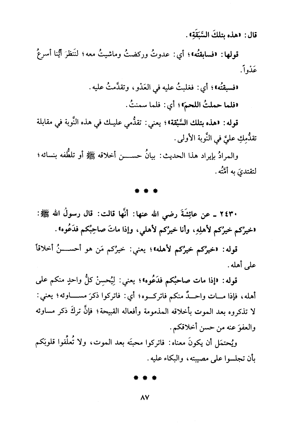 2430 - عن عائِشَةَ رضي الله عنها: أنَّها قالت: قال رسولُ الله - صلى الله عليه وسلم -: "خيرُكم خيرُكم لأهلِهِ، وأنا خيرُكم لأهلي، وإذا ماتَ صاحِبُكم فدَعُوه".