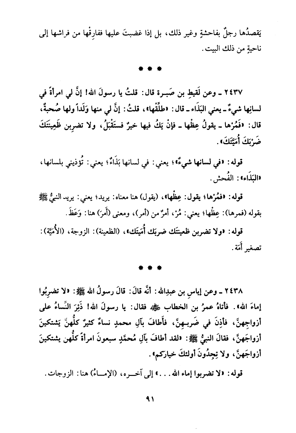 2438 - وعن إياسِ بن عبدِ الله: أنَّه قالَ: قالَ رسولُ الله - صلى الله عليه وسلم -: "لا تضرِبُوا إماءَ الله". فأتاهُ عمرُ بن الخطاب - رضي الله عنه - فقال: يا رسولَ الله! ذَئِرَ النِّساءُ على أزواجِهنَّ، فأذِنَ في ضَربهِنَّ، فأَطافَ بآلِ محمدٍ نساءٌ كثيرٌ كلُّهنَّ يَشتكينَ أزواجَهنَّ، فقالَ النبيُّ - صلى الله عليه وسلم -: "لقد أطافَ بآلِ مُحمَّدٍ سبعونَ امرأةً كلُّهن يشتكينَ أزواجَهنَّ، ولا تِجِدُونَ أولئكَ خيارَكم".
