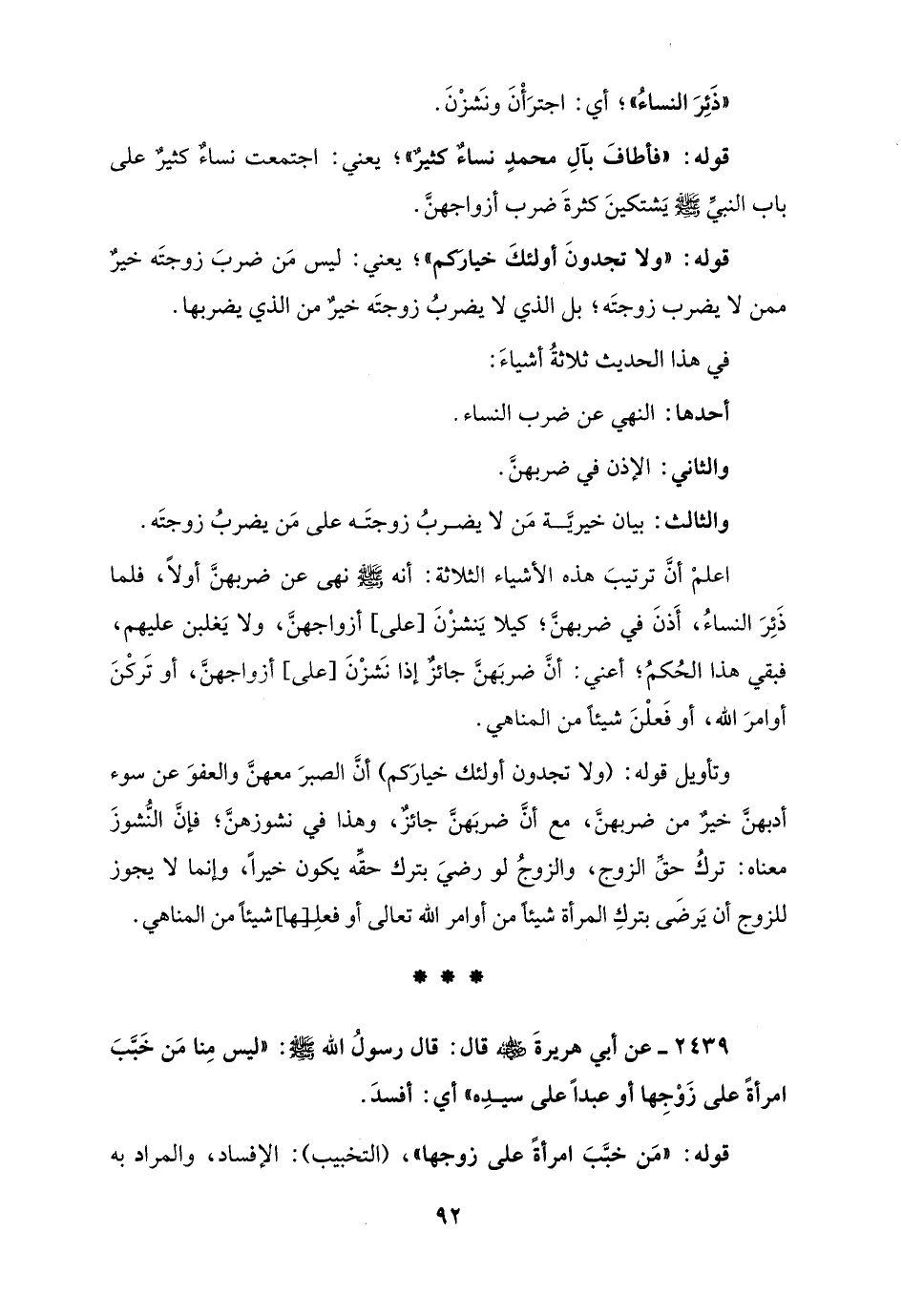 قوله: "فأطافَ بآلِ محمدٍ نساءٌ كثيرٌ"؛ يعنىِ: اجتمعت نساءٌ كثيرٌ على باب النبيِّ - صلى الله عليه وسلم - يَشتكينَ كثرةَ ضرب أزواجهنَّ.