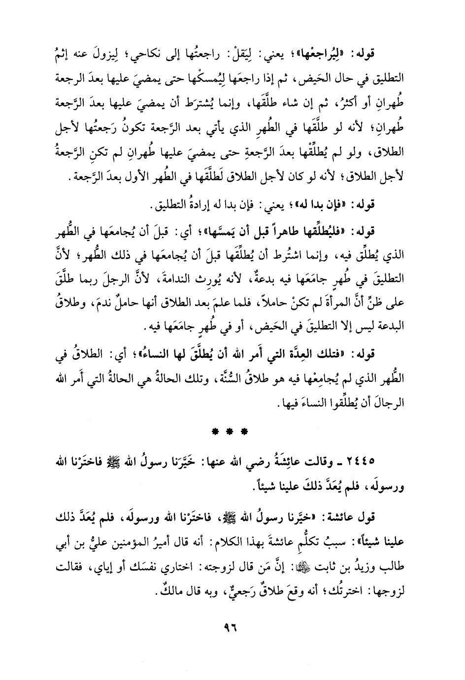 قول عائشة: "خيَّرنا رسولُ الله - صلى الله عليه وسلم -، فاختَرْنا الله ورسولَه، فلم يُعَدَّ ذلك علينا شيئًا": سببُ تكلُّمِ عائشةَ بهذا الكلام: أنه قال أميرُ المؤمنين عليُّ بن أبي طالب وزيدُ بن ثابت - رضي الله عنهما -: إنَّ مَن قال لزوجته: اختاري نفسَك أو إياي، فقالت لزوجها: اخترتُك؛ أنه وقعَ طلاقٌ رَجعيٌّ، وبه قال مالكٌ.
