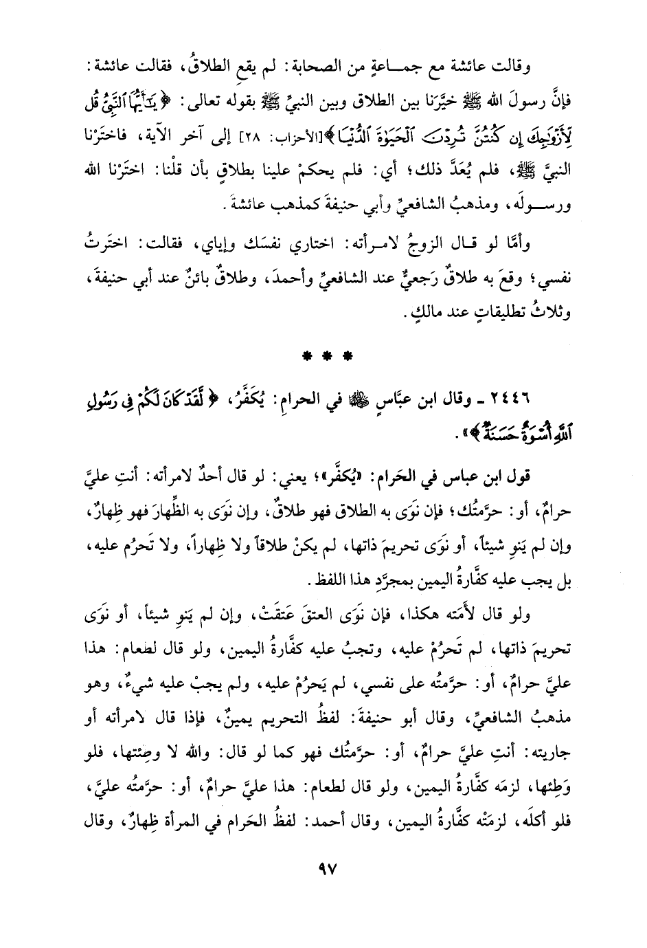 2446 - وقال ابن عبَّاسٍ - رضي الله عنهما - في الحرامِ: يُكَفَّرُ، {لَقَدْ كَانَ لَكُمْ فِي رَسُولِ اللَّهِ أُسْوَةٌ حَسَنَةٌ} ".
