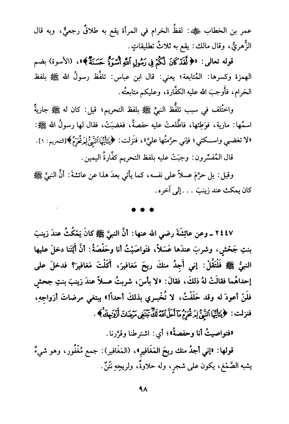 2447 - وعن عائِشَةَ رضي الله عنها: أنَّ النبيَّ - صلى الله عليه وسلم - كانَ يَمْكُثُ عندَ زينبَ بنْتِ جَحْشٍ، وشربَ عندَها عَسَلًا، فتَواصَيْتُ أنا وحَفْصَةُ: أنَّ أَيَّتَنا دخلَ عليها النبيُّ - صلى الله عليه وسلم - فَلْتَقُلْ: إني أَجِدُ منكَ ريحَ مَغافيرَ، أَكَلْتَ مَغافيرَ؟ فدخلَ على إحداهُما فقالَتْ لهُ ذلكَ، فقالَ: "لا بأسَ، شربتُ عسلًا عندَ زينبَ بنتِ جحشٍ، فلَنْ أعودَ له، وقد حَلَفْتُ، لا تُخْبري بذلكَ أحدًا! " يبتغي مرضاةَ أزواجِهِ، فنزلت: {يَاأَيُّهَا النَّبِيُّ لِمَ تُحَرِّمُ مَا أَحَلَّ اللَّهُ لَكَ تَبْتَغِي مَرْضَاتَ أَزْوَاجِكَ}.