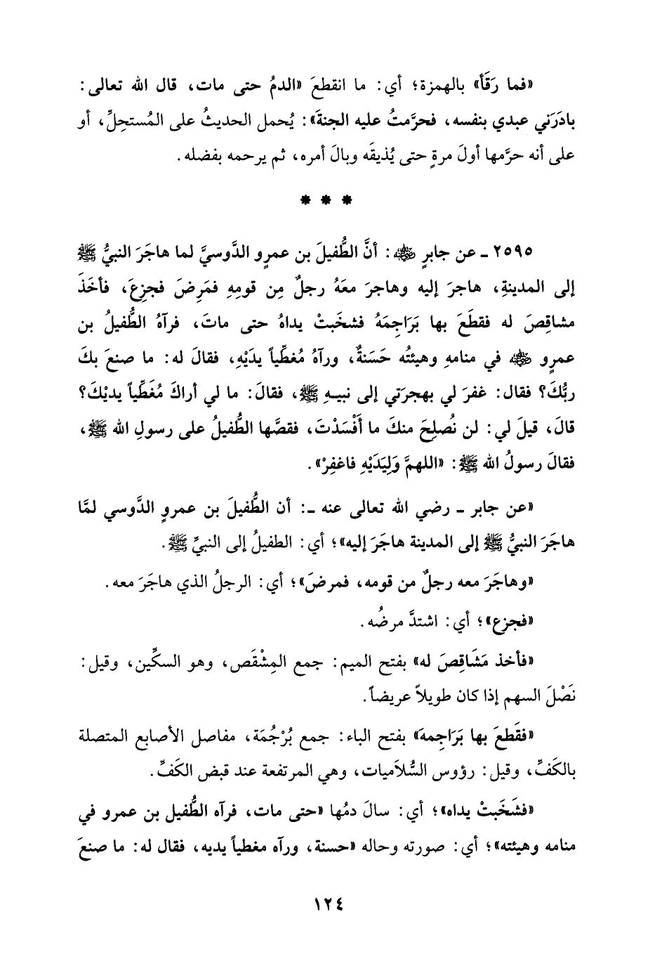 2595 - عن جابرٍ - رضي الله عنه -: أن الطُّفيلَ بن عمرٍو الدَّوسيَّ لما هاجَرَ النبيُّ - صلى الله عليه وسلم - إلى المدينةِ، هاجرَ إليه وهاجرَ معَهُ رجلٌ مِن قومِهِ فمَرِضَ فجزِعَ، فأخَذَ مشاقِصَ له فقطَعَ بها بَرَاجِمَهُ فشخَبتْ يداهُ حتى ماتَ، فرآهُ الطُّفيلُ بن عمرٍو - رضي الله عنه - في منامهِ وهيئتُه حَسَنةٌ، ورآهُ مُغطِّيًا يدَيْهِ، فقالَ له: ما صنعَ بكَ ربُّكَ؟ فقال: غفرَ لي بهجرَتي إلى نبيهِ - صلى الله عليه وسلم -، فقالَ: ما لي أراكَ مُغَطِّياً يديْكَ؟ قالَ، قيلَ لي: لن نُصلِحَ منكَ ما أَفْسَدْتَ، فقصَّها الطُّفيلُ على رسولِ الله - صلى الله عليه وسلم -، فقالَ رسولُ الله - صلى الله عليه وسلم -: "اللهمَّ وَلِيَدَيْهِ فاغفِرْ".