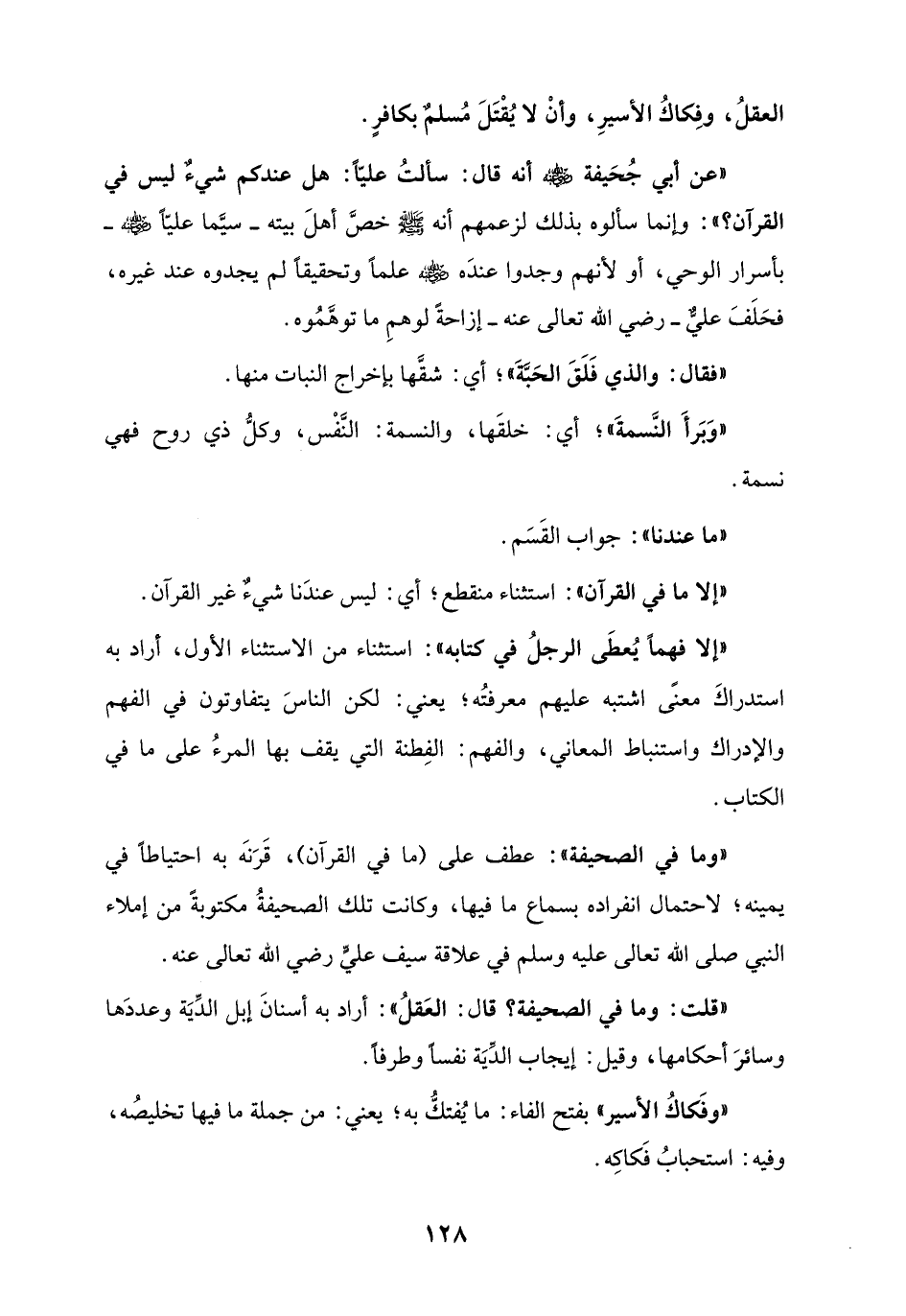 "عن أبي جُحَيفة - رضي الله عنه - أنه قال: سألتُ عليًّا: هل عندكم شيء ليس في القرآن؟ ": وإنما سألوه بذلك لزعمهم أنه - صلى الله عليه وسلم - خصَّ أهلَ بيته - سيَّما عليًّا - رضي الله عنه - بأسرار الوحي، أو لأنهم وجدوا عندَه - رضي الله عنه - علماً وتحقيقًا لم يجدوه عند غيره، فحَلَفَ عليُّ - رضي الله تعالى عنه - إزاحة لوهمِ ما توهَّمُوه.