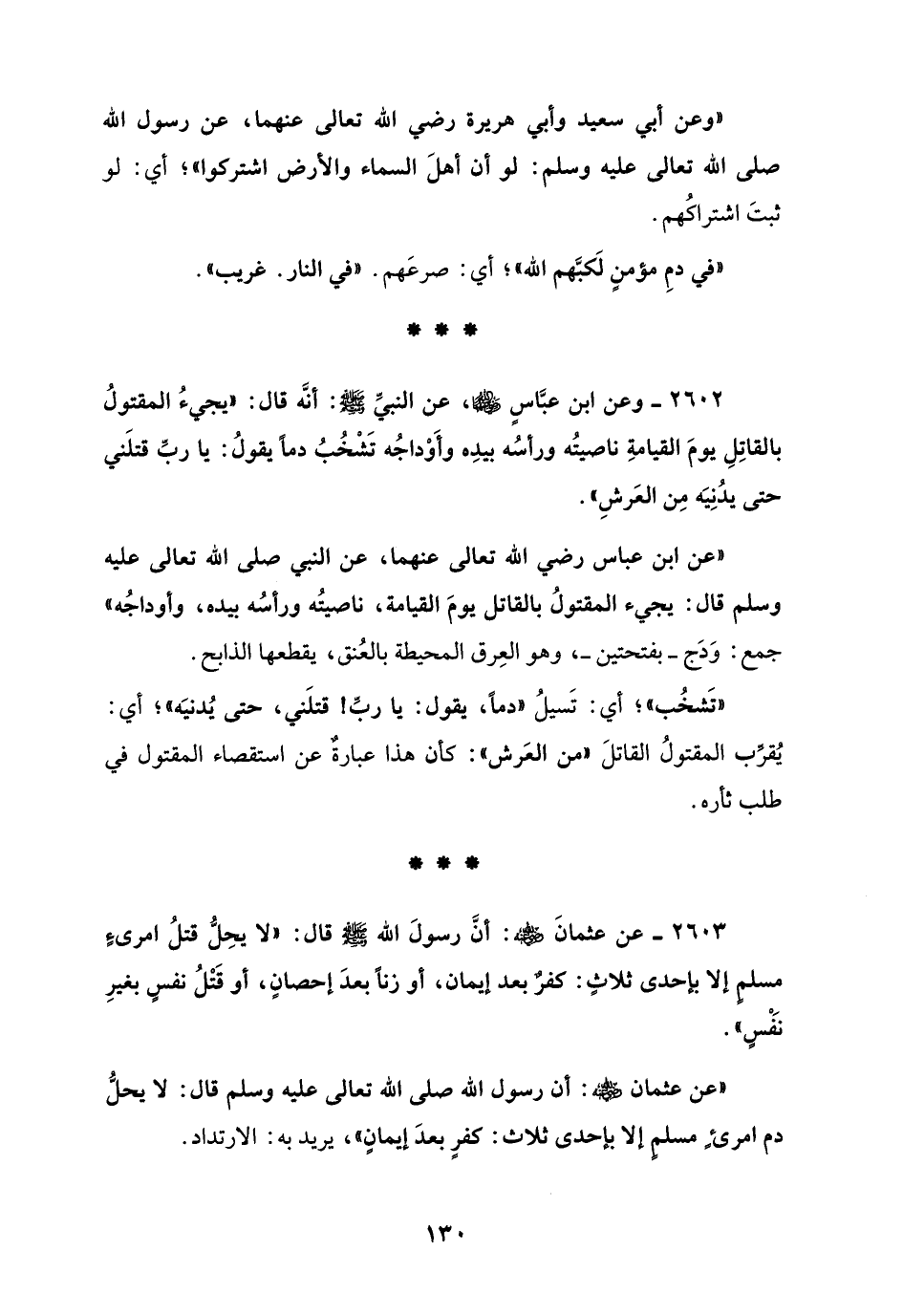 2603 - عن عثمانَ - رضي الله عنه -: أن رسولَ الله - صلى الله عليه وسلم - قال: "لا يحِلُّ قتلُ امرئٍ مسلمٍ إلا بإحدى ثلاثٍ: كفرٌ بعد إيمان، أو زناً بعدَ إحصانٍ، أو قَتْلُ نفسٍ بغيرِ نفسٍ".