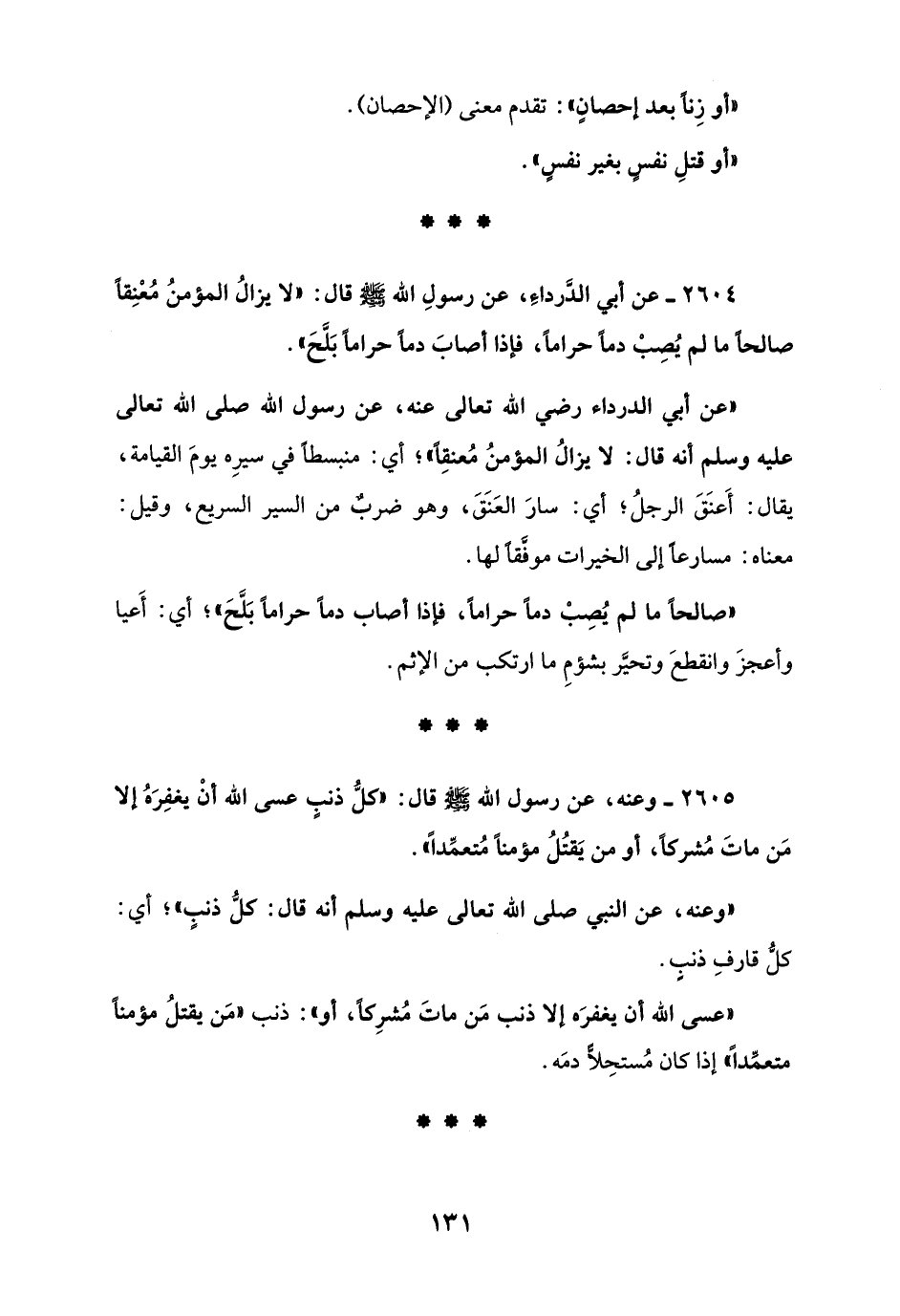 2604 - عن أبي الدَّرداء، عن رسولِ الله - صلى الله عليه وسلم - قال: "لا يزالُ المؤمنُ مُعْنِقا صالحاً ما لم يُصِبْ دماً حراماً، فإذا أصابَ دماً حراما بَلَّحَ".