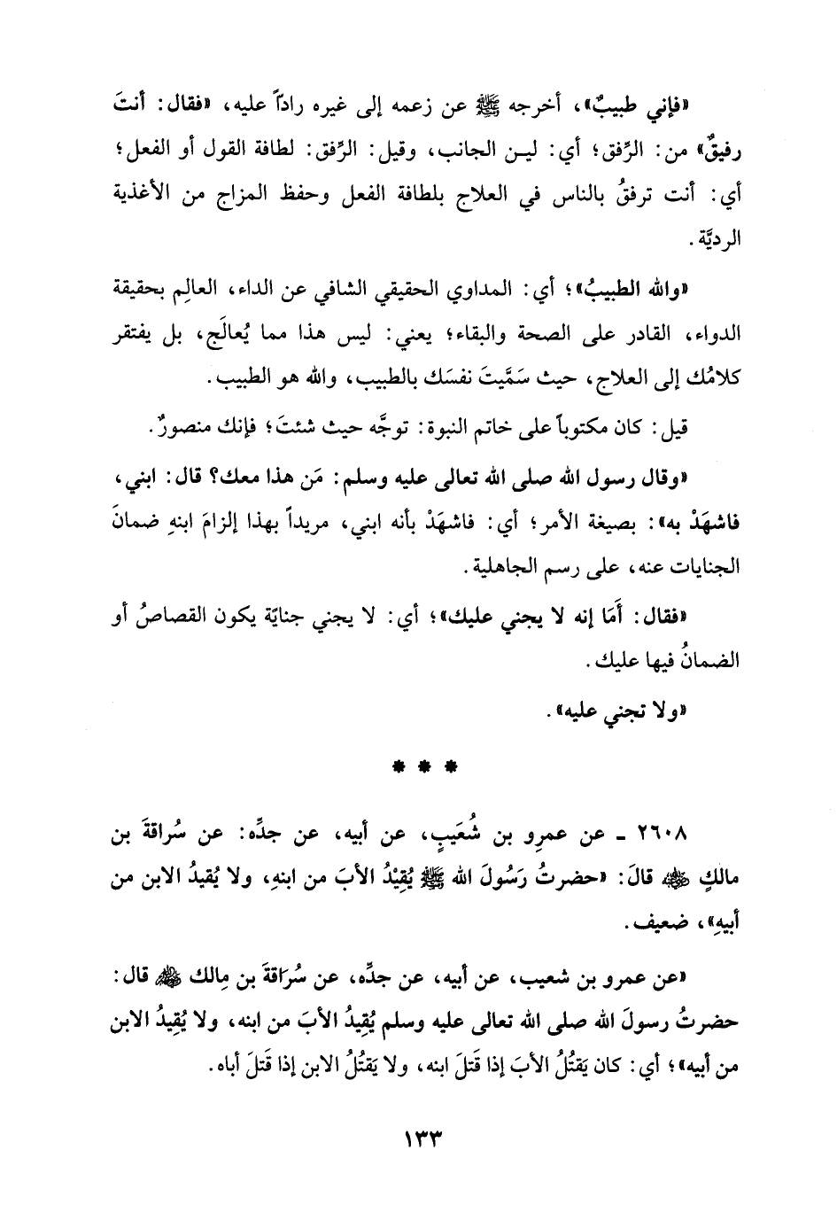 "عن عمرو بن شعيب، عن أبيه، عن جده، عن سُراقةَ بن مِالك - رضي الله عنه - قال: حضرتُ رسولَ الله صلى الله تعالى عليه وسلم يُقِيدُ الأبَ من ابنه، ولا يُقِيدُ الابن من أبيه"؛ أي: كان يَقتُلُ الأبَ إذا قَتلَ ابنه، ولا يَقتُلُ الابن إذا قَتلَ أباه.
