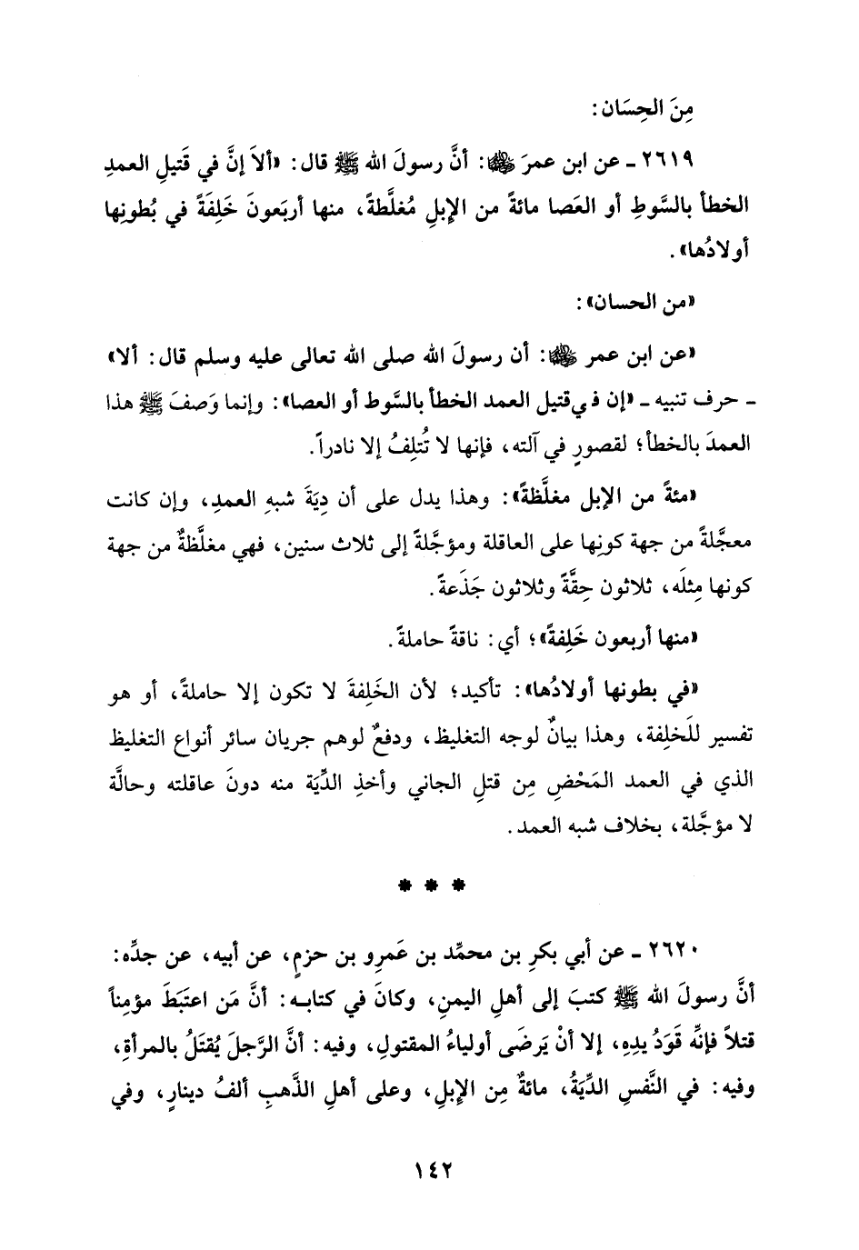 2619 - عن ابن عمرَ: أن رسولَ الله - صلى الله عليه وسلم - قال: "ألاَ إنَّ في قَتيلِ العمدِ الخطأ بالسَّوطِ أو العَصا مائةً من الإبلِ مُغلَّطة، منها أربَعونَ خَلِفَةً في بُطوبها أولادُها".