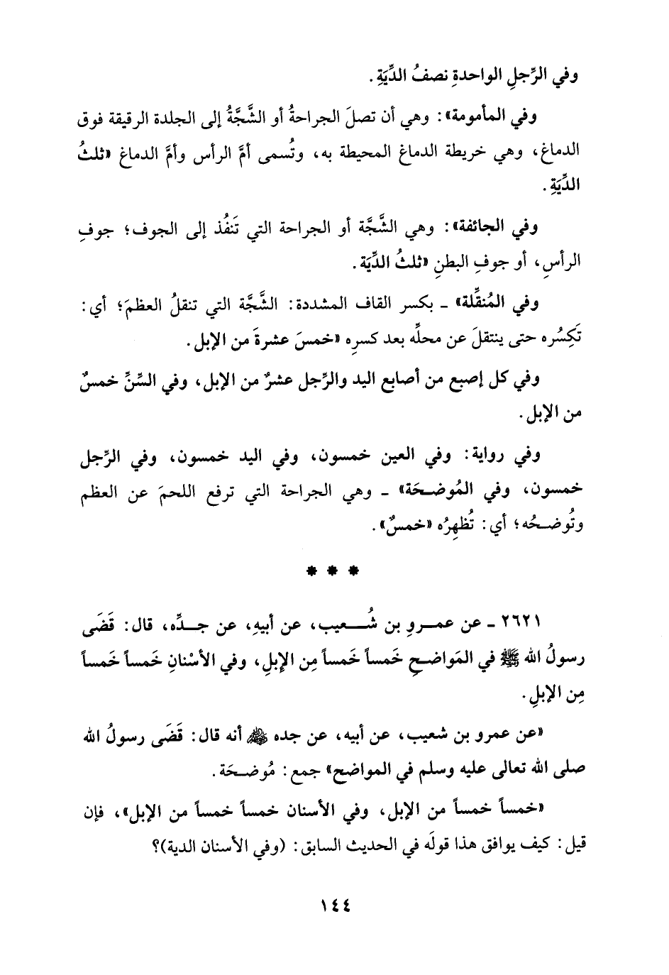 2621 - عن عمروِ بن شُعيب، عن أبيهِ، عن جدِّه، قال: قَضَى رسولُ الله - صلى الله عليه وسلم - في المَواضح خَمساً خَمسا مِن الإبلِ، وفي الأسنانِ خَمساً خَمساً مِن الإبلِ.