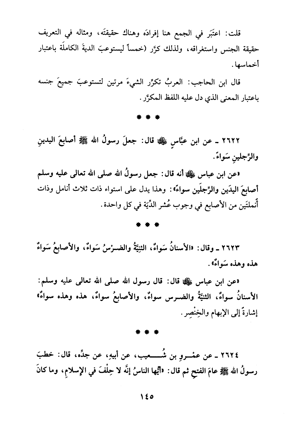 "عن ابن عباس أنه قال: جعل رسولُ الله صلى الله تعالى عليه وسلم أصابعَ اليدَين والرِّجلَين سواءً": وهذا يدل على استواء ذات ثلاث أنامل وذات أنملتَين من الأصابع في وجوب عُشر الدِّيَة في كل واحدة.