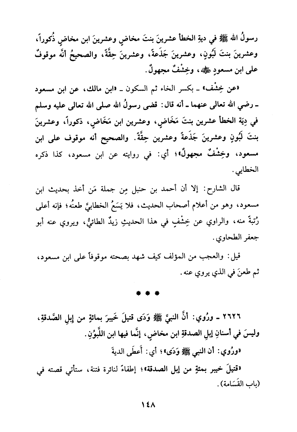 رسولُ الله - صلى الله عليه وسلم - في ديةِ الخطأ عشرينَ بنتَ مخاضٍ وعشرينَ ابن مخاضٍ ذُكوراً، وعشرينَ بنتَ لبونٍ، وعشرينَ جَذَعةً، وعشرينَ حِقَّةً، والصحيحُ أنَّه موقوفٌ على ابن مسعودٍ - رضي الله عنه -، وخِشْفٌ مجهولٌ.