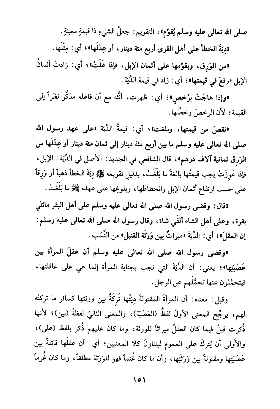 "نقصَ من قيمتها، وبلغت"؛ أي: قيمةُ الدِّيَة "على عهد رسول الله صلى الله تعالى عليه وسلم ما بين أربع مئة دينار إلى ثمان مئة دينار أو عِدْلَها من الوَرِق ثمانية آلاف درهم"، قال الشافعي في الجديد: الأصل في الدِّيَة: الإبل، فإذا عَوِزَتْ يجب قيمتُها بالغةً ما بَلَغَتْ، بدليلِ تقويمه - صلى الله عليه وسلم - دِيَةَ الخطأ ذهبا أو وَرِقاً على حسب ارتفاع أثمان الإبل وانحطاطها، وبلوغِها على عهده - صلى الله عليه وسلم - ما بَلَغَتْ.