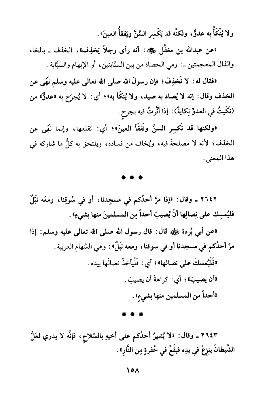 "عن أبي بُردة - رضي الله عنه - قال: قال رسول الله صلى الله تعالى عليه وسلم: إذا مرَّ أحدكم في مسجدنا أو في سوقنا، ومعه نبَلٌ": وهي السِّهام العربية.
