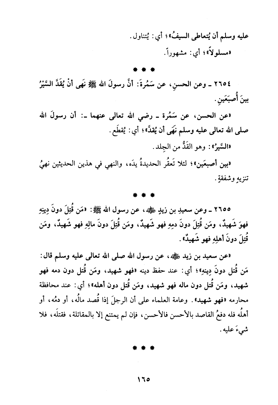 "عن سعيد بن زيد - رضي الله عنه -، عن رسول الله صلى الله تعالى عليه وسلم قال: مَن قُتل دونَ دِينهِ"؛ أي: عند حفظ دينه "فهو شهيد، ومَن قُتل دون دمه فهو شهيد، ومَن قُتل دون ماله فهو شهيد، ومَن قُتل دون أهله"؛ أي: عند محافظة محارمه "فهو شهيد". وعامة العلماء على أن الرجلَ إذا قُصد مالُه، أو دمُه، أو أهلُه فله دفعُ القاصد بالأحسن فالأحسن، فإن لم يمتنع إلا بالمقاتلة، فقتلَه، فلا شيءَ عليه.