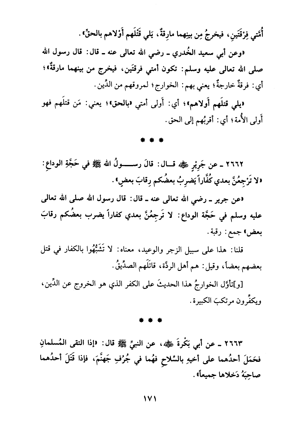 2662 - عن جَرِيرٍ - رضي الله عنه - قال: قالَ رسولُ الله - صلى الله عليه وسلم - في حَجَّةِ الوداعِ: "لا تَرْجِعُنَّ بعدي كُفَّاراً يَضرِبُ بعضُكم رِقابَ بعضٍ".