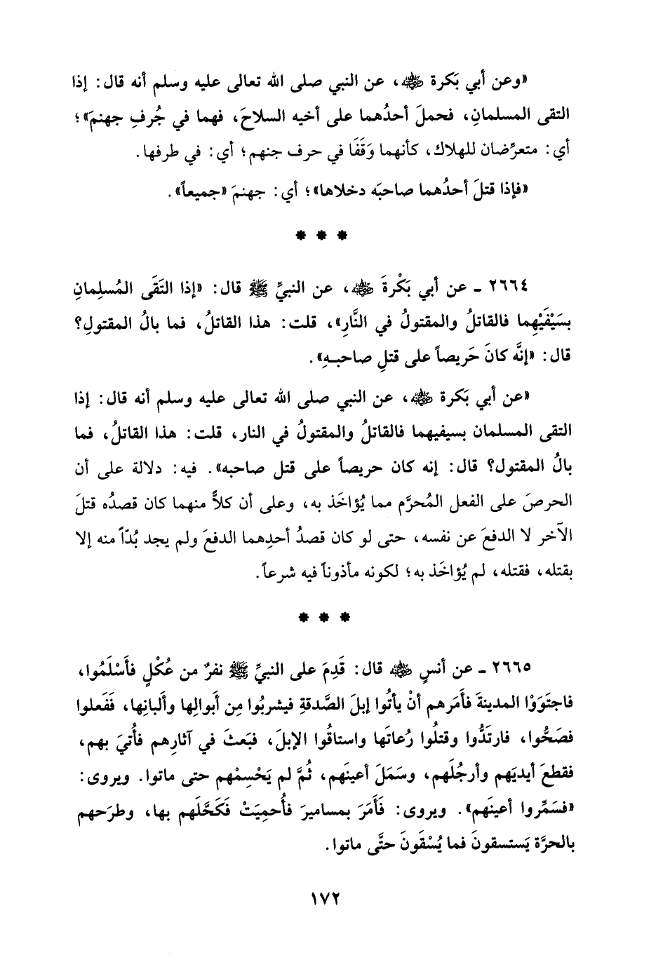 2664 - عن أبي بَكْرةَ - رضي الله عنه -، عن النبيِّ - صلى الله عليه وسلم - قال: "إذا التَقَى المُسلِمانِ بسَيْفَيْهِما فالقاتلُ والمقتولُ في النَّارِ"، قلت: هذا القاتلُ، فما بالُ المقتولِ؟ قال: "إنه كانَ حَريصاً عَلى قتلِ صاحبهِ".