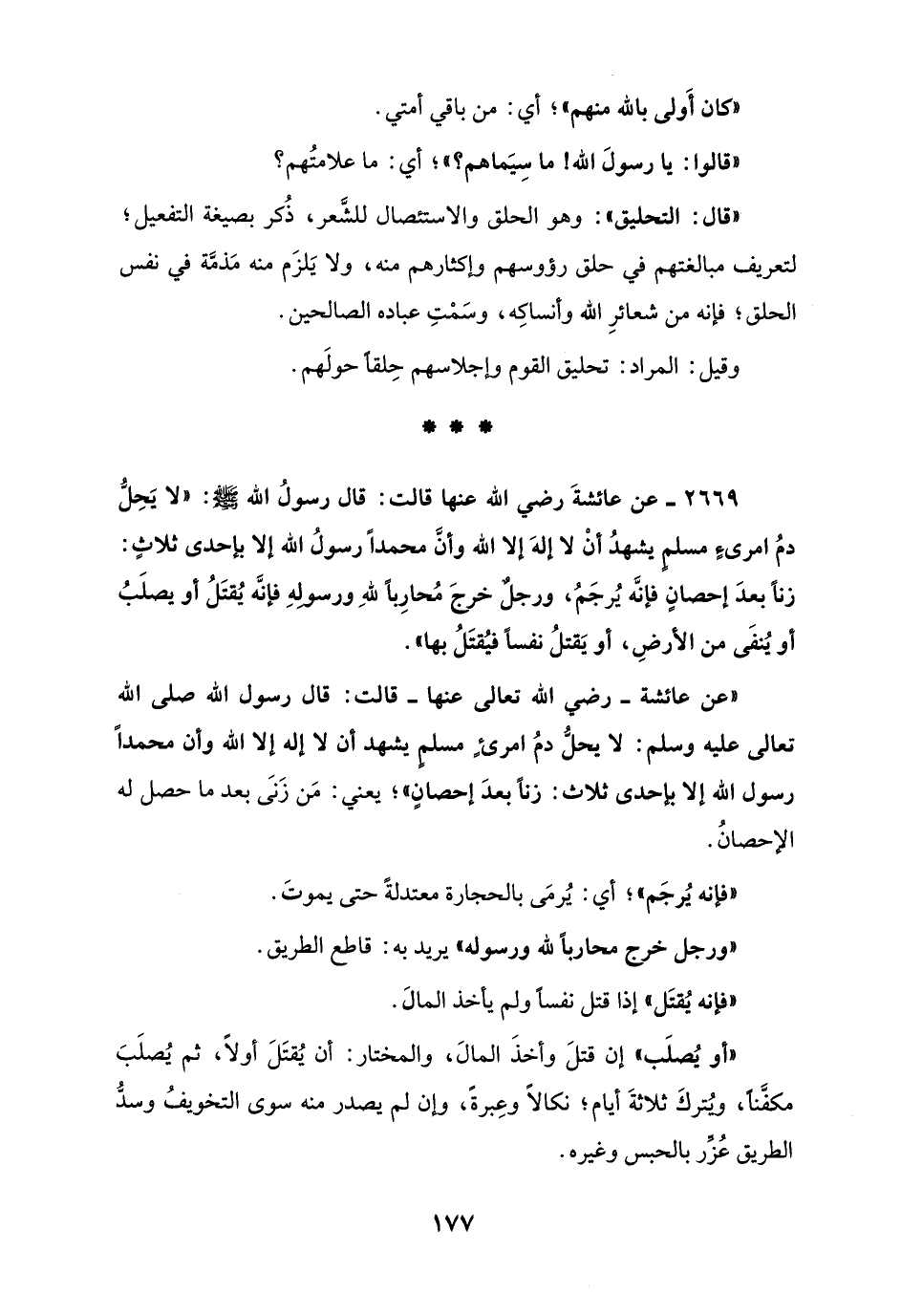 2669 - عن عائشةَ رضي الله عنها قالت: قال رسولُ الله - صلى الله عليه وسلم -: "لا يَحِلُّ دمُ امرئٍ مسلم يشهدُ أنْ لا إلهَ إلا الله وأنَّ محمداً رسولُ الله إلا بإحدى ثلاثٍ: زناً بعدَ إحصانٍ فإنَّه يُرجَمُ، ورجلٌ خرجَ مُحارِباً للهِ ورسوله فإنَّه يُقتَلُ أو يصلَبُ أو يُنفَى من الأرضِ، أو يَقتلُ نفسا فيُقتَلُ بها".