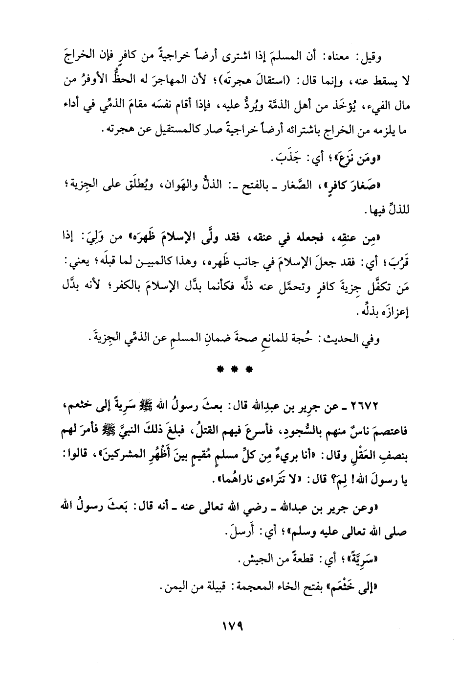 2672 - عن جرِير بن عبدِ الله قال: بعثَ رسولُ الله - صلى الله عليه وسلم - سَرِيةً إلى خثعم، فاعتصمَ ناسٌ منهم بالسُّجودِ، فأسرعَ فيهم القتلُ، فبلغَ ذلكَ النبيَّ - صلى الله عليه وسلم - فأمرَ لهم بنصفِ العَقْلِ وقال: "أنا بريءٌ مِن كل مسلم مُقيمٍ بينَ أَظْهُرِ المشركينَ"، قالوا: يَا رسولَ الله! لِمَ؟ قال: "لا تتَراءى ناراهُما".