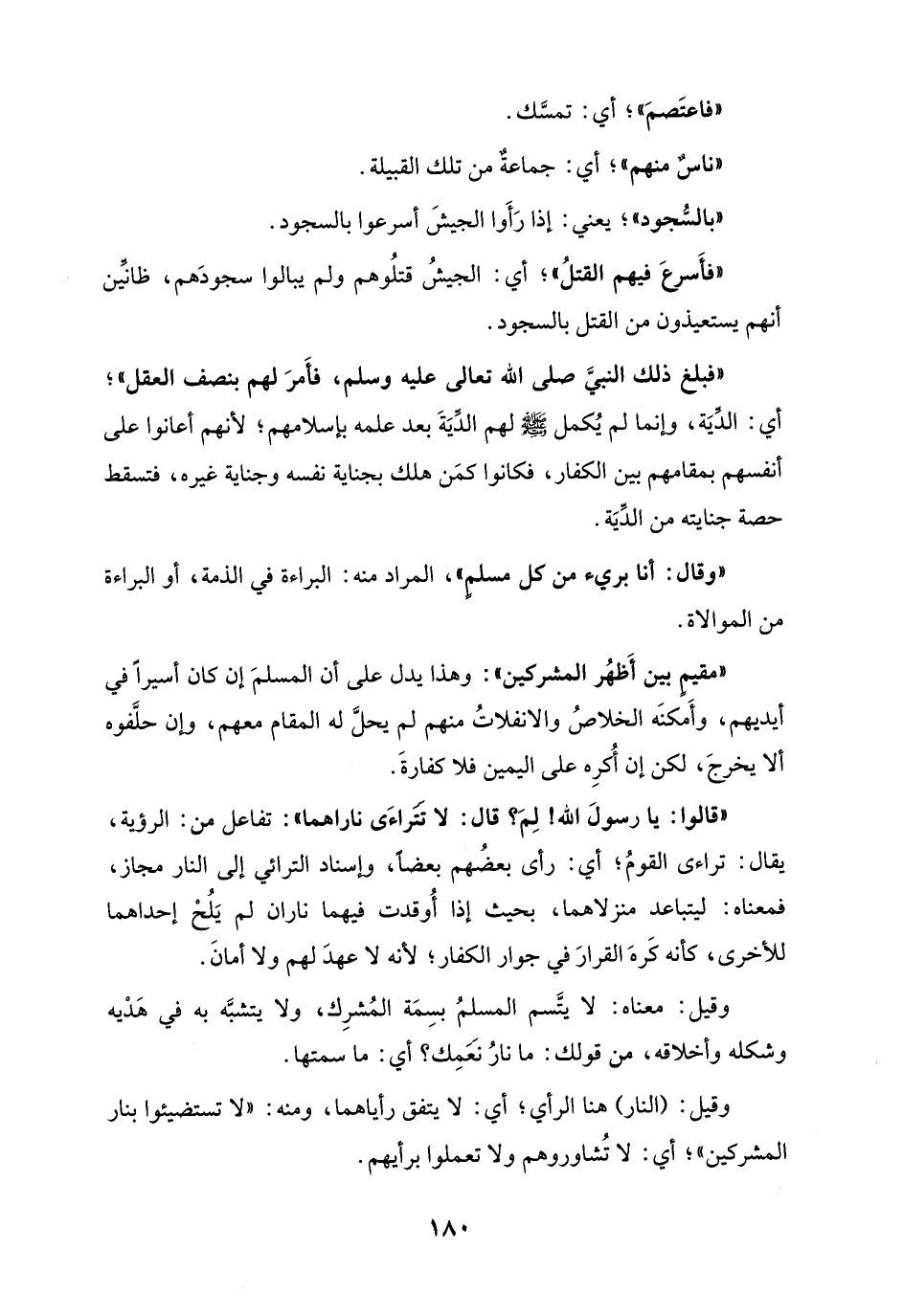 "قالوا: يَا رسولَ الله! لِمَ؟ قال: لا تتَراءَى ناراهما": تفاعل من: الرؤية، يقال: تراءى القومُ؛ أي: رأى بعضُهم بعضًا، وإسناد الترائي إلى النَّار مجاز، فمعناه: ليتباعد منزلاهما، بحيث إذا أُوقدت فيهما ناران لم يَلُحْ إحداهما للأخرى، كأنه كَرهَ القرارَ في جوار الكفار؛ لأنه لا عهدَ لهم ولا أمانَ.