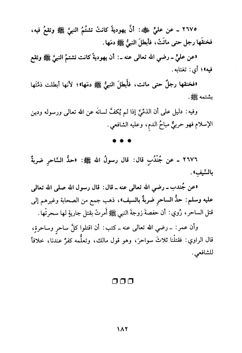 2675 - عن عليٍّ - رضي الله عنه -: أن يهوديةً كانتْ تشتُمُ النَّبِيّ - صَلَّى اللهُ عَلَيْهِ وَسَلَّمَ - وتقعُ فيه، فخنقَها رجل حتَّى ماتَتْ، فأبطلَ النبيُّ - صلى الله عليه وسلم - دمَها.