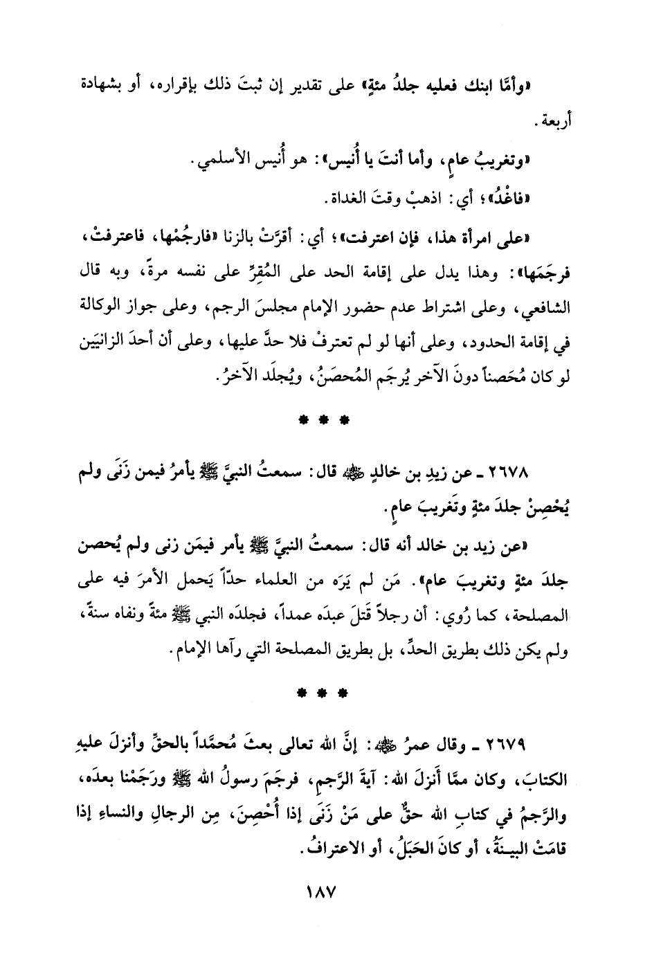 2678 - عن زيدِ بن خالدٍ - رضي الله عنه - قال: سمعتُ النَّبِيّ - صَلَّى اللهُ عَلَيْهِ وَسَلَّمَ - يأمرُ فيمن زنىَ ولم يُحْصِنْ جلدَ مئةٍ وتَغريبَ عامٍ.