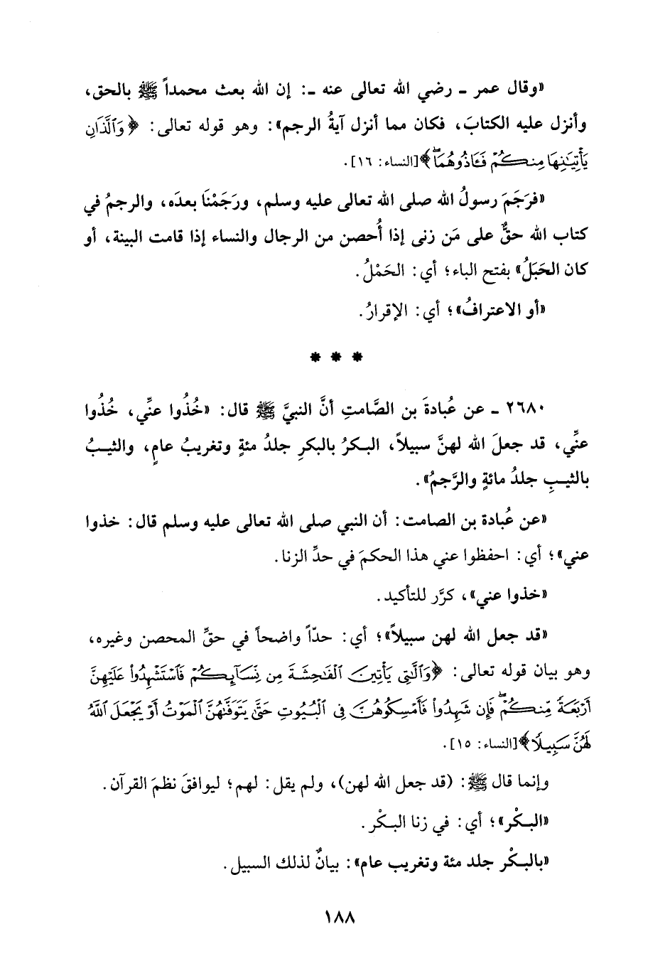 "وقال عمر - رضي الله تعالى عنه -: إن الله بعث محمدًا - صلى الله عليه وسلم - بالحق، وأنزل عليه الكتابَ، فكان مما أنزل آيةُ الرجم": وهو قوله تعالى: {وَاللَّذَانِ يَأْتِيَانِهَا مِنْكُمْ فَآذُوهُمَا} [النساء: 16].