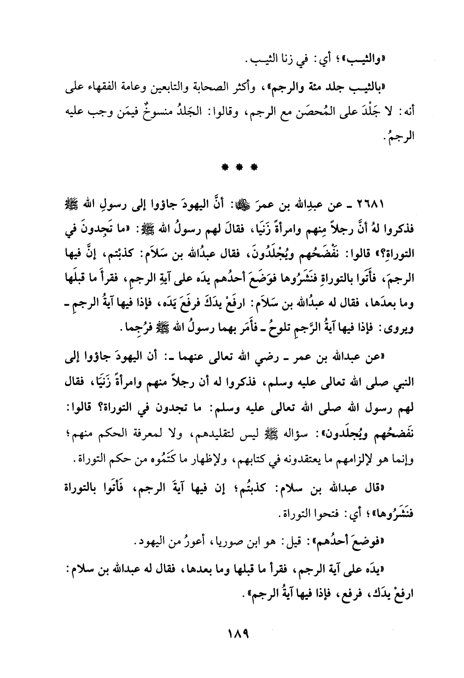 2681 - عن عبدِ الله بن عمرَ: أن اليهودَ جاؤوا إلى رسولِ الله - صلى الله عليه وسلم - فذكروا لهُ أن رجلًا مِنهم وامرأة زَنيَا، فقالَ لهم رسولُ الله - صلى الله عليه وسلم -: "ما تَجدونَ في التوراةِ؟، قالوا: نَفْضَحُهم ويُجْلَدُونَ، فقال عبدُ الله بن سَلَام: كذبْتم، إن فيها الرجمَ، فأتَوا بالتوراةِ فنَشَرُوها فوَضَعَ أحدُهم يدَه على آيةِ الرجم، فقرأَ ما قبلَها وما بعدَها، فقال له عبدُ الله بن سَلَام: ارفَعْ يدَكَ فرفَعَ يَدَه، فإذا فيها آيةُ الرجم - ويروى: فإذا فيها آيةُ الرَّجم تلوحُ - فأَمَر بهما رسولُ الله - صلى الله عليه وسلم - فرُجِما.
