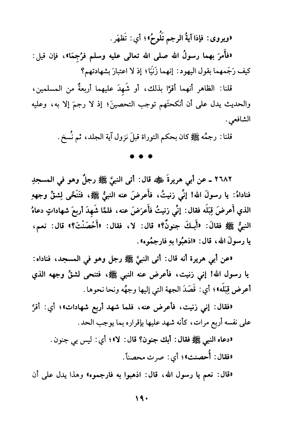 2682 - عن أبي هريرةَ - صلى الله عليه وسلم - قال: أتى النَّبِيّ - صَلَّى اللهُ عَلَيْهِ وَسَلَّمَ - رجلٌ وهو في المسجدِ فناداهُ: يَا رسولَ الله! إنِّي زنيتُ، فأَعرضَ عنه النبيُّ - صلى الله عليه وسلم -، فتَنَحَّى لِشقِّ وجههِ الذي أَعرضَ قِبَلَه فقال: إنِّي زنيتُ فأَعرَضَ عنه، فلمَّا شَهِدَ أربعَ شهاداتٍ دعاهُ النبيُّ - صلى الله عليه وسلم - فقالَ: "أَبكَ جنون؟ " قال: لا، فقال: "أَحْصَنْتَ؟ " قال: نعم، يَا رسولَ الله، قال: "اذهبُوا بهِ فارجمُوه".