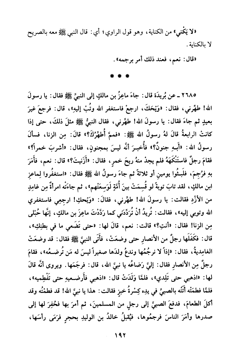 2685 - عن بُريدَة قال: جاءَ ماعِزُ بن مالك إلى النبيِّ - صلى الله عليه وسلم - فقال: يَا رسولَ الله! طهِّرني، فقال: "ويحَكَ، ارجعْ فاستغفر الله وتُبْ إليهِ"، قال: فرجعَ غيرَ بعيدٍ ثم جاءَ فقال: يَا رسولَ الله! طهِّرني، فقال النبيُّ - صلى الله عليه وسلم - مثلَ ذلكَ، حتَّى إذا كانت الرابعةُ قالَ لهُ رسولُ الله - صلى الله عليه وسلم -: "فممَّ أُطهِّرُكَ؟ " قالَ: مِن الزنا، فسألَ رسولُ الله: "أَبهِ جنونٌ؟ " فأُخبرَ أنَّه ليسَ بمجنونٍ، فقال: "أشربَ خمراً؟ " فقامَ رجلٌ فاستَنْكَهَهُ فلم يجدْ منهُ ريحَ خمرٍ، فقال: "أَزَنيتَ؟ " قال: نعم، فأَمَرَ بهِ فرُجِمَ، فلَبثُوا يومينِ أو ثلاثةً ثم جاءَ رسولُ الله - صلى الله عليه وسلم - فقال: "استغفُروا لِماعزِ ابن مالك، لقد تابَ توبةً لو قُسِمَتْ بينَ أُمَّةٍ لَوَسِعَتْهم"، ثم جاءَتْه امرأةٌ مِن غامِدٍ من الأزْدِ فقالت: يَا رسولَ الله! طهِّرني، فقالَ: "ويحكِ! ارجِعِي فاستغفري الله وتوبي إليه"، فقالت: تُريدُ أنْ تُرَدِّدَني كما رَدَّدْتَ ماعِزَ بن مالكٍ، إنَّها حُبْلى مِن الزنا! فقال: "أنتِ؟ " قالت: نعم، قالَ لها: "حتَّى تَضَعي ما في بطنِكِ"، قال: فكَفَلَها رجلٌ من الأنصارِ حتَّى وضعَتْ، فأَتَى النبيَّ - صلى الله عليه وسلم - فقال: قد وضعَتْ الغامِديةُ، فقال: "إذًا لا نرجُمُها وندع ولدَها صغيراً لَيسَ له مَن تُرضعُه"، فقامَ رجلٌ مِن الأنصارِ فقال: إليَّ رَضاعُه يَا نبيَّ الله، قال: فرجَمَها. ويروى أنَّه قالَ لها: "اذهبي حتَّى تَلِدي"، فلمَّا وَلَدَتْ قال: "اذهبي فأَرضعيهِ حتَّى تَفْطِميه"، فلمَّا فطمَتْه أتته بالصبيِّ في يدِه كِسْرةُ خبزٍ فقالت: هذا يَا نبيَّ الله! قد فطمْتُه وقد كلَ الطعامَ، فدفعَ الصبيَّ إلى رجلٍ من المسلمينَ، ثم أمرَ بها فحُفِرَ لها إلى صدرها وأمَرَ النَّاسَ فرجمُوها، فيُقبلُ خالدُ بن الوليدِ بحجرٍ فرَمَى رأسَها،