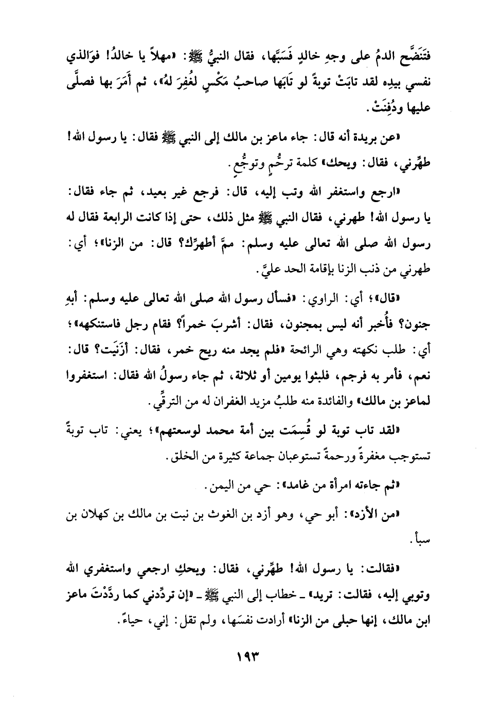 "ارجع واستغفر الله وتب إليه، قال: فرجع غير بعيد، ثم جاء فقال: يَا رسول الله! طهرني، فقال النَّبِيّ - صلى الله عليه وسلم - مثل ذلك، حتَّى إذا كانت الرابعة فقال له رسول الله صلى الله تعالى عليه وسلم: ممَّ أطهرِّك؟ قال: من الزنا"؛ أي: طهرني من ذنب الزنا بإقامة الحد عليَّ.
