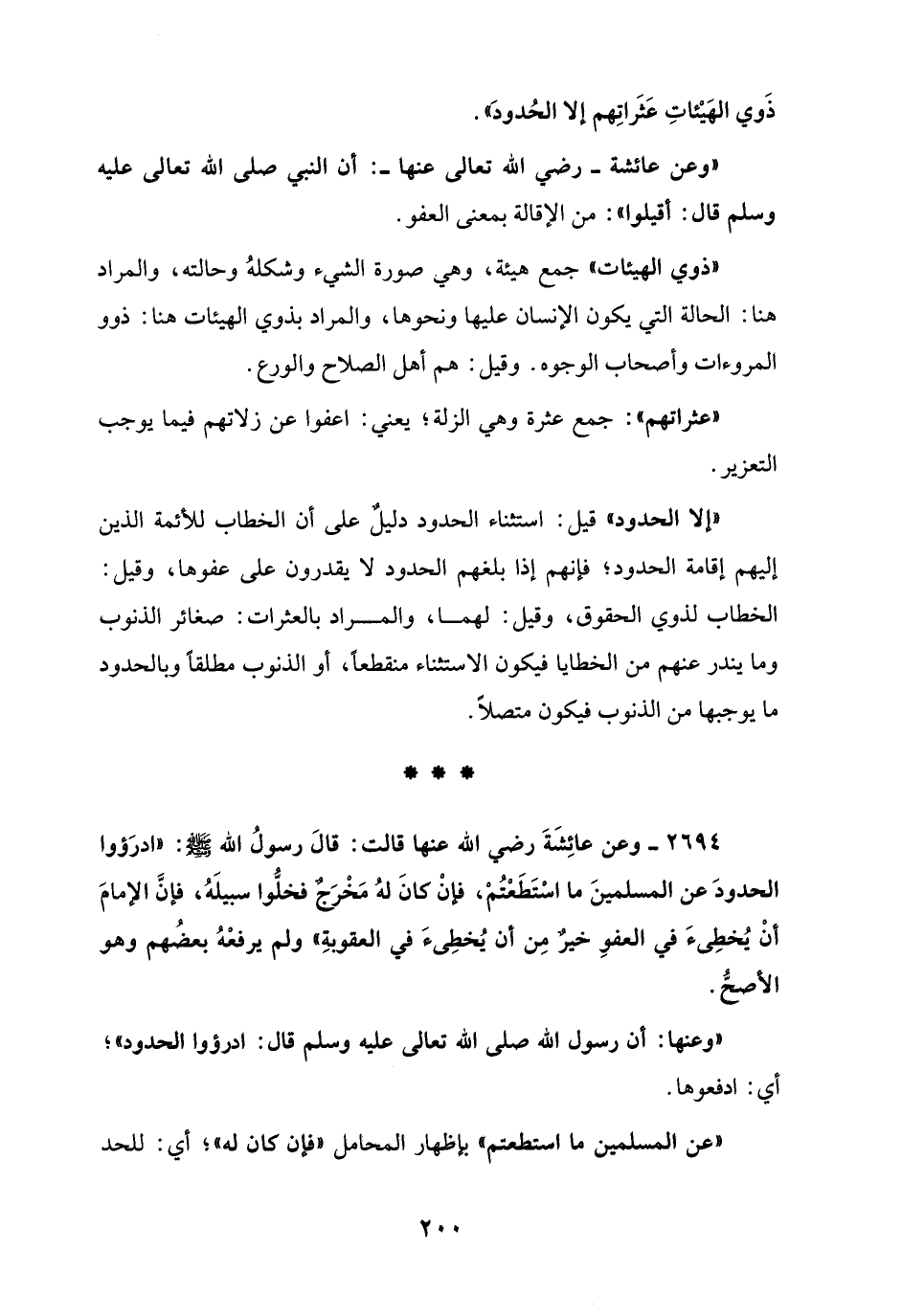 "إلَّا الحدود" قيل: استثناء الحدود دليلٌ على أن الخَطَّاب للأئمة الذين إليهم إقامة الحدود؛ فإنهم إذا بلغهم الحدود لا يقدرون على عفوها، وقيل: الخَطَّاب لذوي الحقوق، وقيل: لهما، والمراد بالعثرات. صغائر الذنوب وما يندر عنهم من الخطايا فيكون الاستثناء منقطعًا، أو الذنوب مطلقًا وبالحدود ما يوجبها من الذنوب فيكون متصلًا.