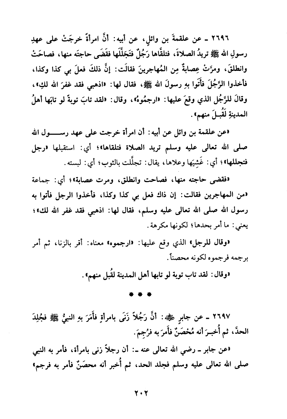 2696 - عن علقمةَ بن وائلٍ، عن أَبيه: أن امرأة خرجَتْ على عهدِ رسولِ الله - صلى الله عليه وسلم - تريدُ الصلاةَ، فتلقَّاها رَجُل فتَجَلَّلَها فقَضَى حاجتَه منها، فصاحَتْ وانطلقَ، ومرَّتْ عِصابةٌ مِن المُهاجرينَ فقالَت: إنَّ ذلكَ فعلَ بي كذا وكذا، فأخذوا الرجلَ فأتَوا بهِ رسولَ الله - صلى الله عليه وسلم -، فقال لها: "اذهبي فقد غفرَ الله لكِ" وقالَ للرَّجُل الذي وقعَ عليها: "ارجمُوه"، وقال: "لقد تابَ توبة لو تابَها أهلُ المدينةِ لَقُبلَ منهم".