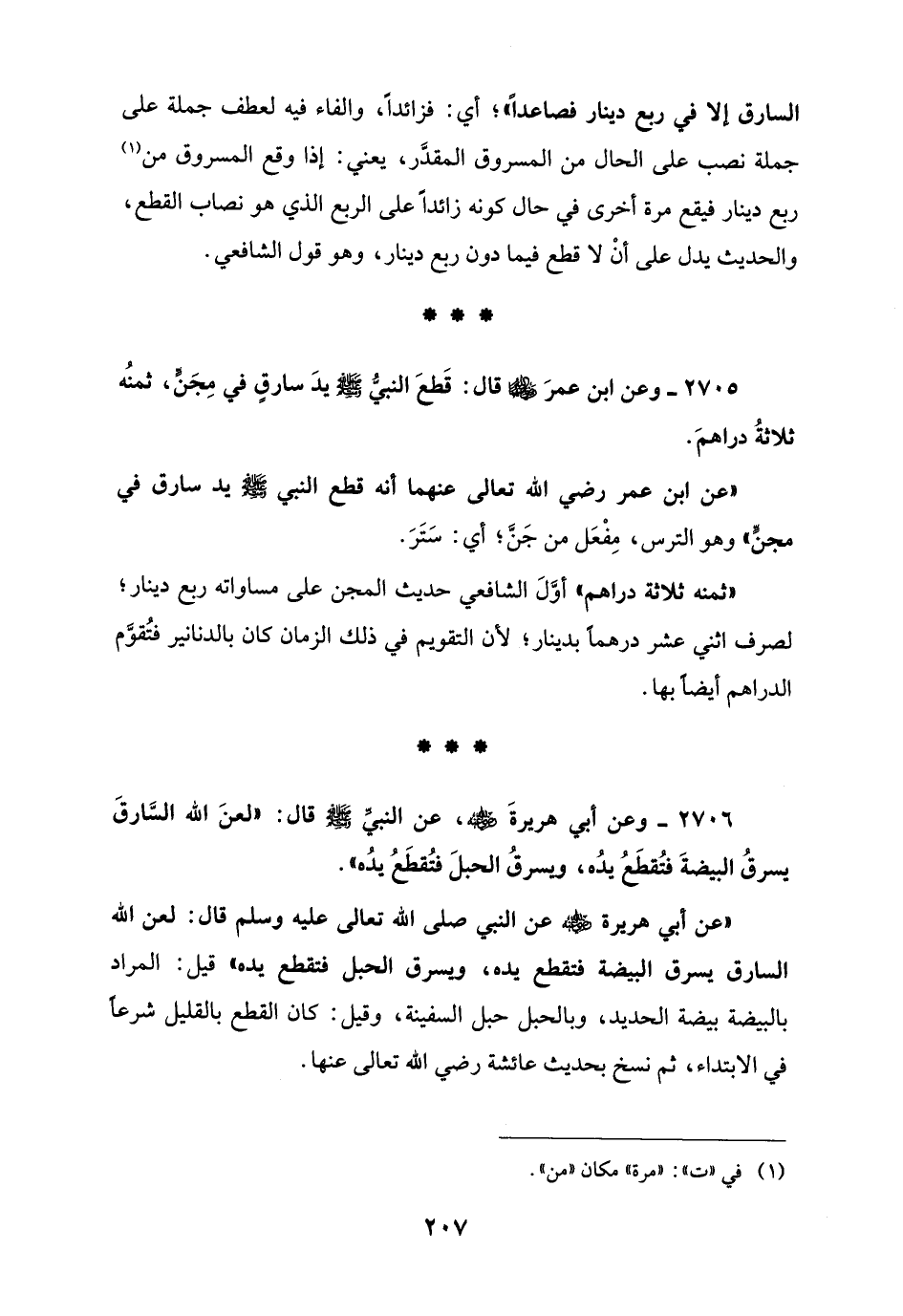 2705 - وعن ابن عمرَ - رضي الله عنهما - قال: قَطعَ النَّبِيّ - صلى الله عليه وسلم - يدَ سارق في مِجَنٍّ، ثمنُه ثلاثةُ دراهمَ.