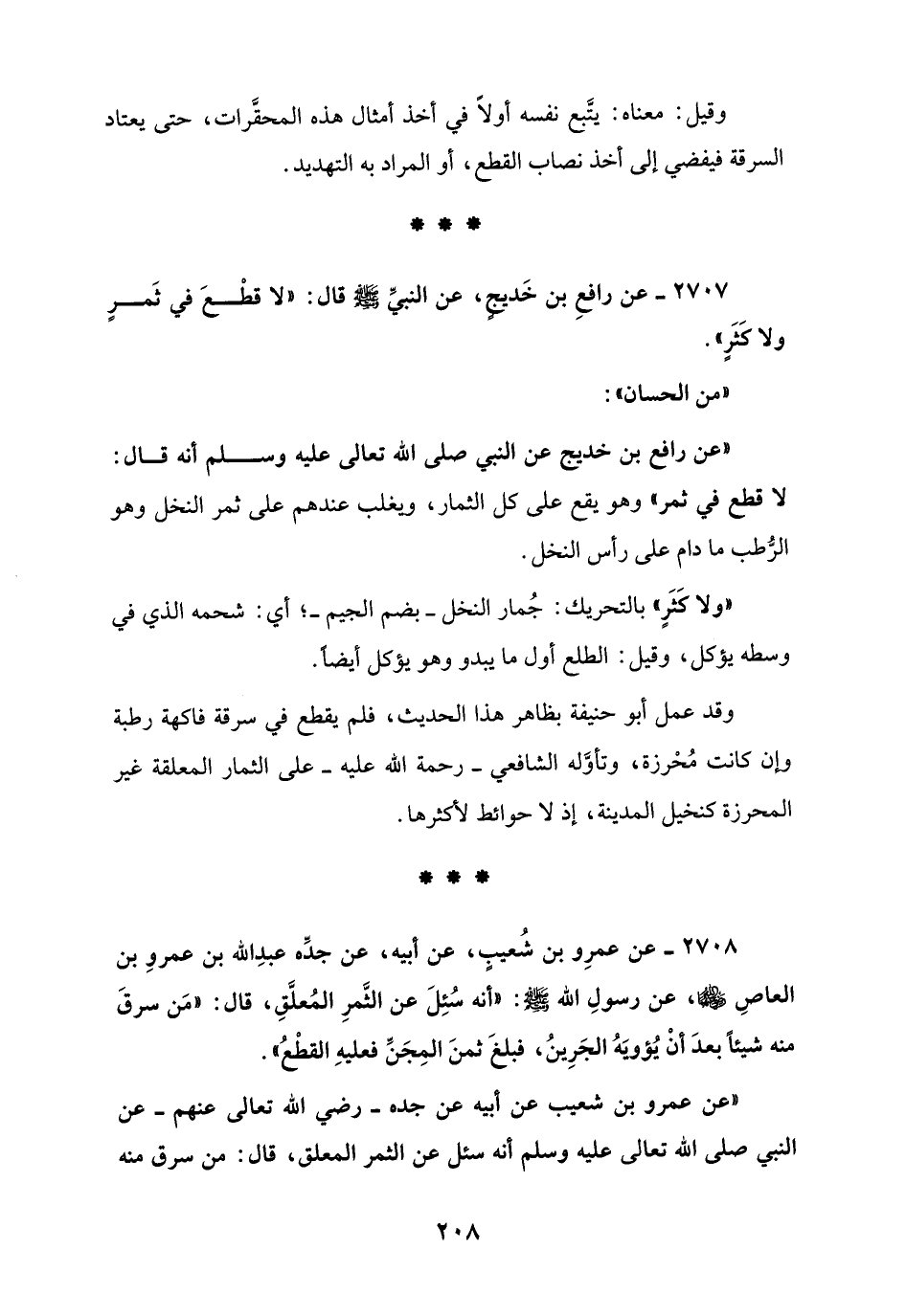 2708 - عن عمرِو بن شُعيبٍ، عن أَبيه، عن جدِّه عبدِ الله بن عمروِ بن العاصِ، عن رسولِ الله - صلى الله عليه وسلم -: "أنَّه سُئِلَ عن الثَّمرِ المُعلَّقِ، قال: "مَن سرقَ منه شيئًا بعدَ أنْ يُؤويَهُ الجَرِينُ، فبلغَ ثمنَ المِجَنِّ فعليهِ القطْعُ".