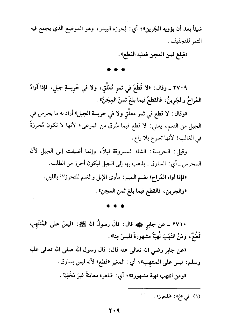 2709 - وقال: "لَا قَطْعَ في ثمرٍ مُعَلَّقٍ، ولا في حَرِيسةِ جبل، فإذا آواهُ المُراحُ والجَرِينُ، فالقطعُ فيما بلغَ ثمنَ المِجَنِّ".