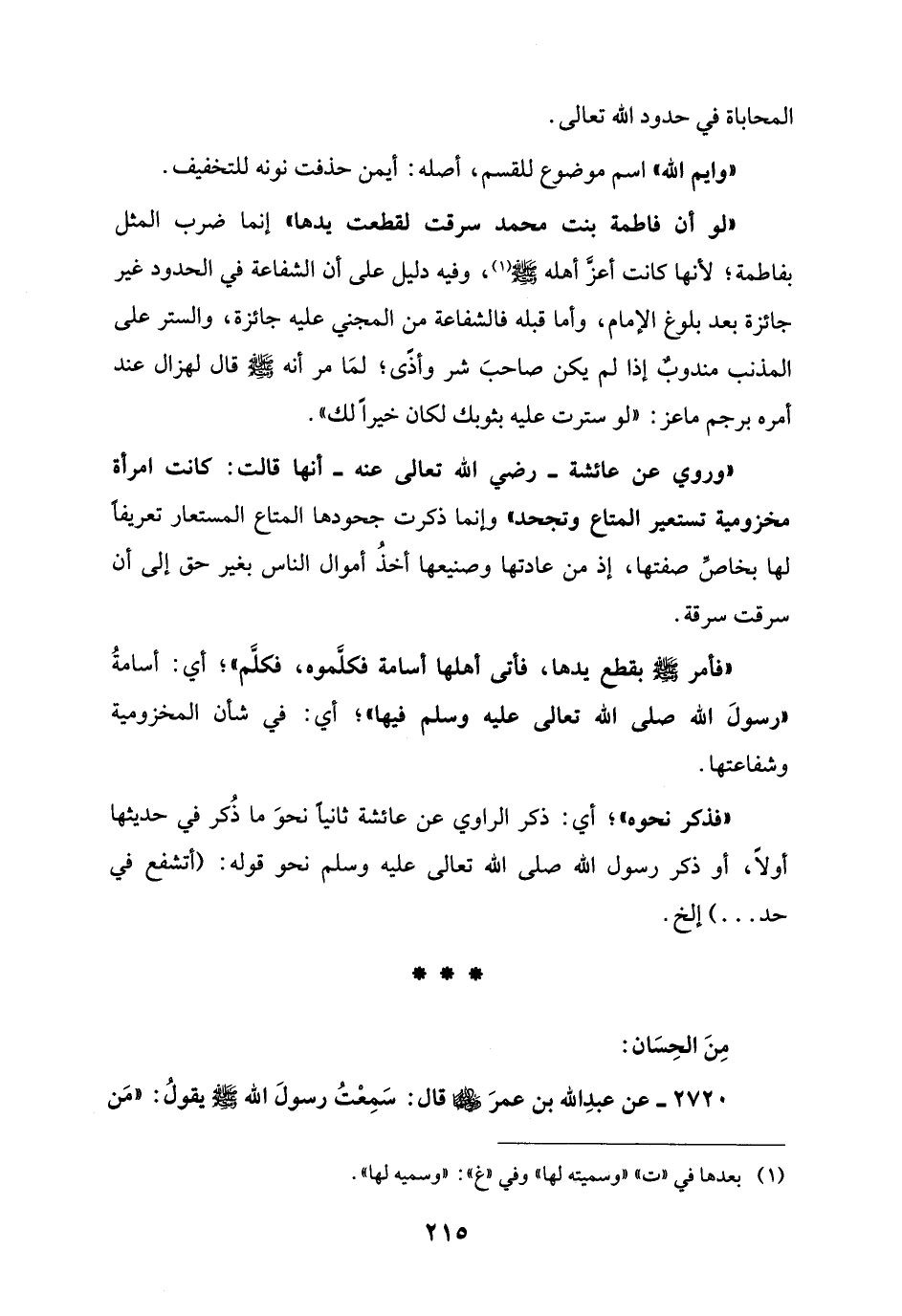 "لو أن فاطمة بنت محمَّد سرقت لقطعت يدها" إنما ضرب المثل بفاطمة؛ لأنها كانت أعز أهله - صلى الله عليه وسلم - (¬1)، وفيه دليل على أن الشفاعة في الحدود غير جائزة بعد بلوغ الإِمام، وأما قبله فالشفاعة من المجني عليه جائزة، والستر على المذنب مندوبٌ إذا لم يكن صاحبَ شر وأذًى؛ لمَا مر أنَّه - صلى الله عليه وسلم - قال لهزال عند أمره برجم ماعز: "لو سترت عليه بثوبك لكان خيرًا لك".