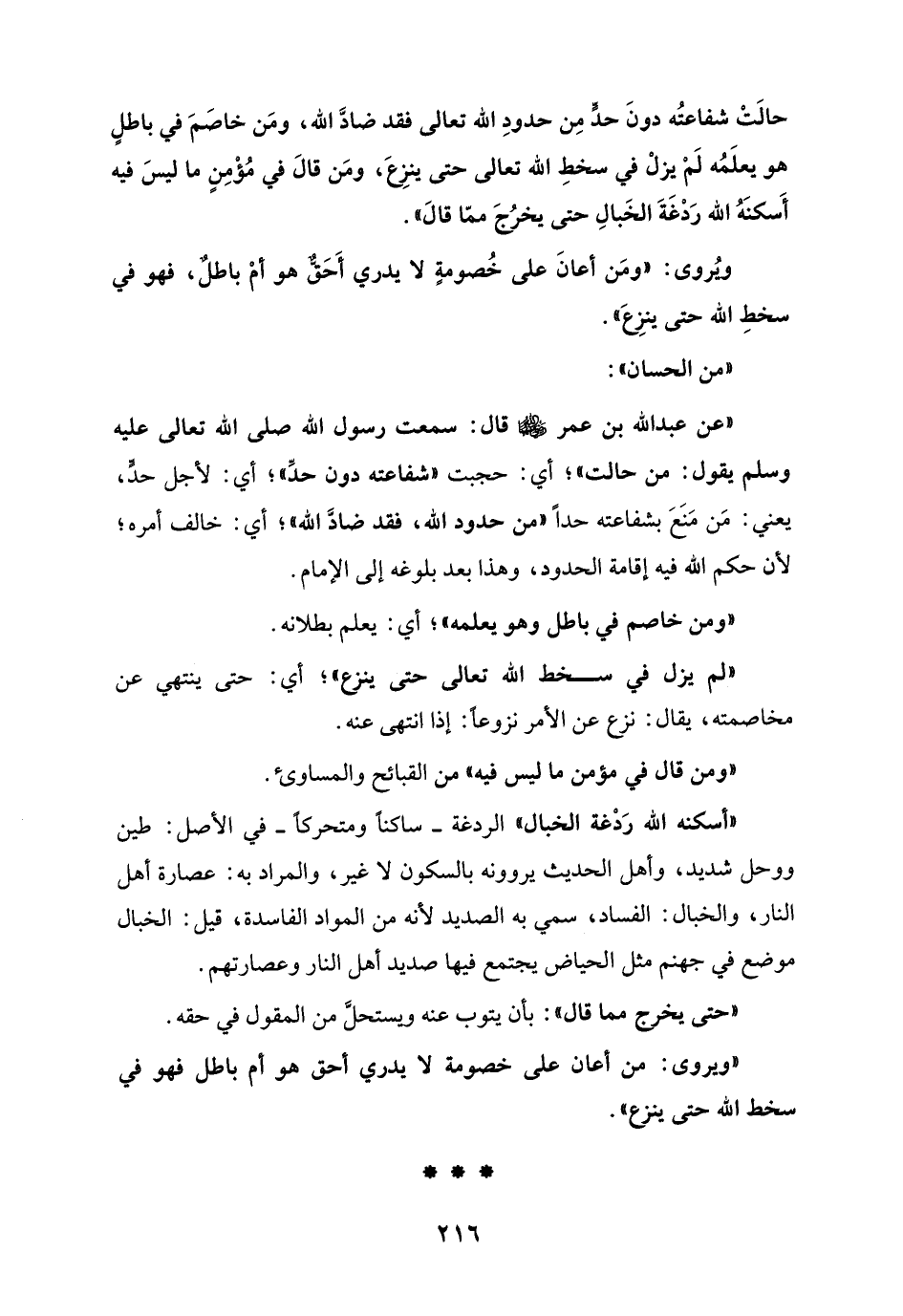 حالَتْ شفاعتُه دونَ حدٍّ مِن حدودِ الله تعالى فقد ضادَّ الله، ومَن خاصَمَ في باطلٍ هو يعلَمُه لَمْ يزلْ في سخطِ الله تعالى حتَّى ينزِعَ، ومَن قالَ في مُؤْمِنٍ ما ليسَ فيه أَسكنَهُ الله رَدْغَةَ الخَبالِ حتَّى يخرُجَ ممّا قالَ".