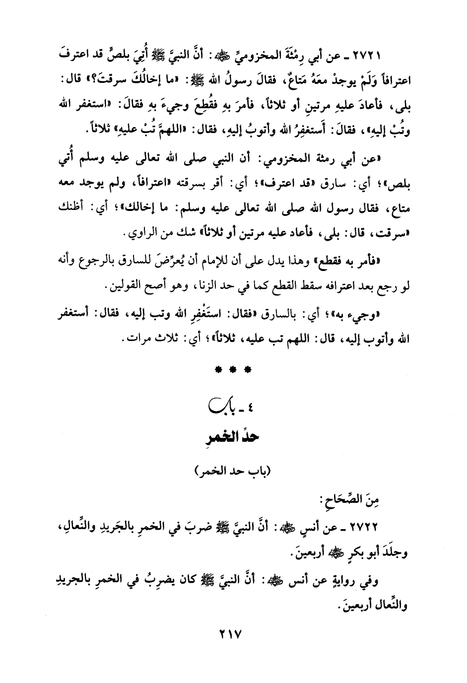 2721 - عن أبي رِمْثَةَ المخزوميِّ - رضي الله عنه -: أن النَّبِيّ - صَلَّى اللهُ عَلَيْهِ وَسَلَّمَ - أُتِيَ بلصٍّ قد اعترتَ اعترافًا وَلَمْ يوجدْ معَهُ مَتاعٌ، فقالَ رسولُ الله - صلى الله عليه وسلم -: "ما إخالُكَ سرقتَ؟ " قال: بلى، فأعادَ عليهِ مرتينِ أو ثلاثًا، فأمرَ بهِ فقُطِعَ وجيءَ بهِ فقالَ: "استغفر الله وتُبْ إليهِ"، فقالَ: أَستغفِرُ الله وأتوبُ إليهِ، فقال: "اللهمَّ تُبْ عليهِ" ثلاثًا.