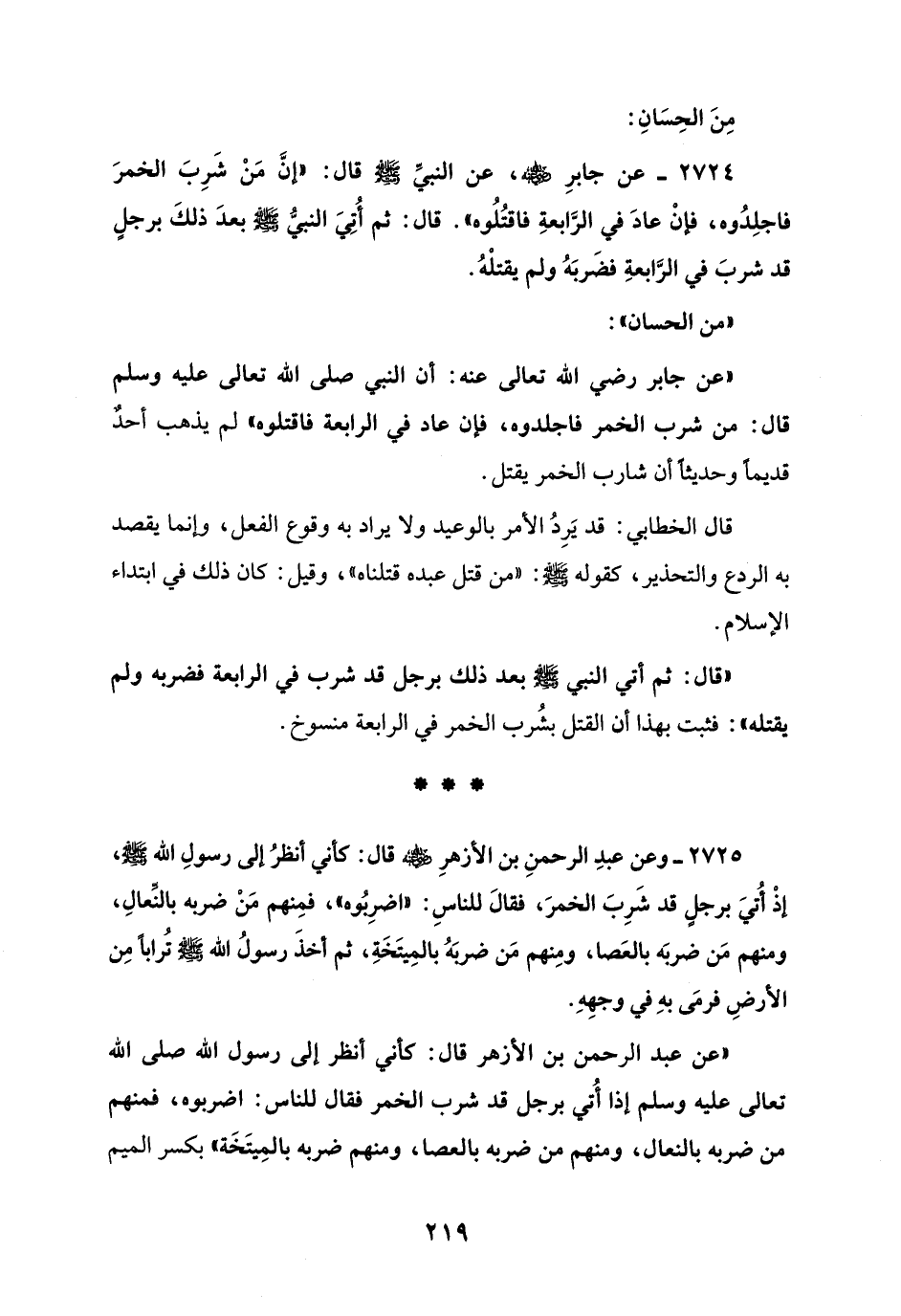 2724 - عن جابرِ - رضي الله عنه -، عن النبيِّ - صلى الله عليه وسلم - قال: "إنَّ مَنْ شَرِبَ الخمرَ فاجلِدُوه، فإنْ عادَ في الرَّابعةِ فاقتُلُوه". قال: ثم أُتِيَ النَّبِيّ - صَلَّى اللهُ عَلَيْهِ وَسَلَّمَ - بعدَ ذلكَ برجلٍ قد شربَ في الرَّابعةِ فضَربَهُ ولم يقتلْهُ.