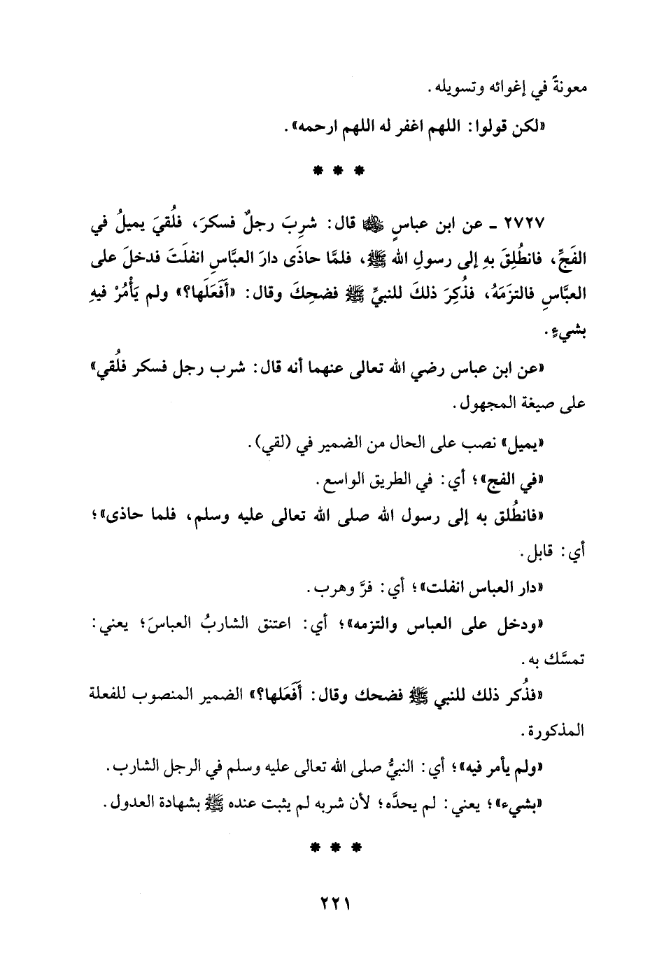 2727 - عن ابن عباسٍ - رضي الله عنه - قال: شرِبَ رجلٌ فسكرَ، فلُقيَ يميلُ في الفَجِّ، فانطُلِقَ بهِ إلى رسولِ الله - صلى الله عليه وسلم -، فلمَّا حاذَى دارَ العبَّاسِ انفلَتَ فدخلَ على العبَّاسِ فالتزَمَهُ، فذُكِرَ ذلكَ للنبيِّ - صلى الله عليه وسلم - فضحِكَ وقال: "أفعَلَها؟ " ولم يَأْمُرْ فيهِ بشيءٍ.