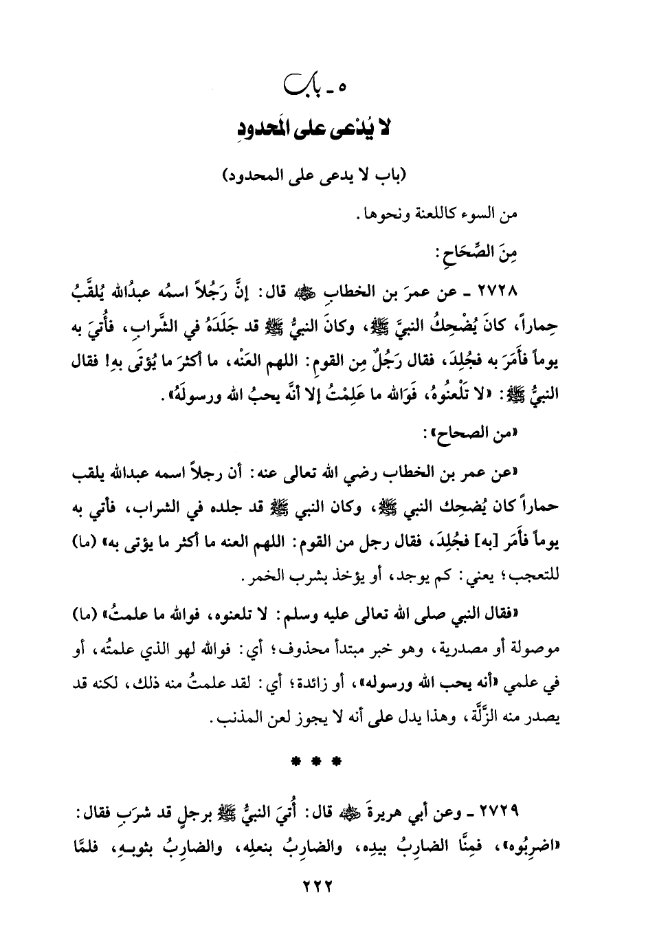 2728 - عن عمرَ بن الخطابِ - رضي الله عنه - قال: إنَّ رَجُلًا اسمُه عبدُ الله يُلقَبُ حِمارًا، كانَ يُضْحِكُ النَّبِيّ - صلى الله عليه وسلم -، وكانَ النبيُّ - صلى الله عليه وسلم - قد جَلَدَهُ في الشرابِ، فأُتيَ به يومًا فأَمَرَ به فجُلِدَ، فقال رَجُلٌ مِن القومِ: اللهمَّ العَنْه، ما أكثرَ ما يُؤتَى بهِ! فقال النبيُّ - صلى الله عليه وسلم -: "لا تَلْعنُوهُ، فَوَالله ما عَلِمْتُ إلَّا أنَّه يحبُ الله ورسولَهُ".