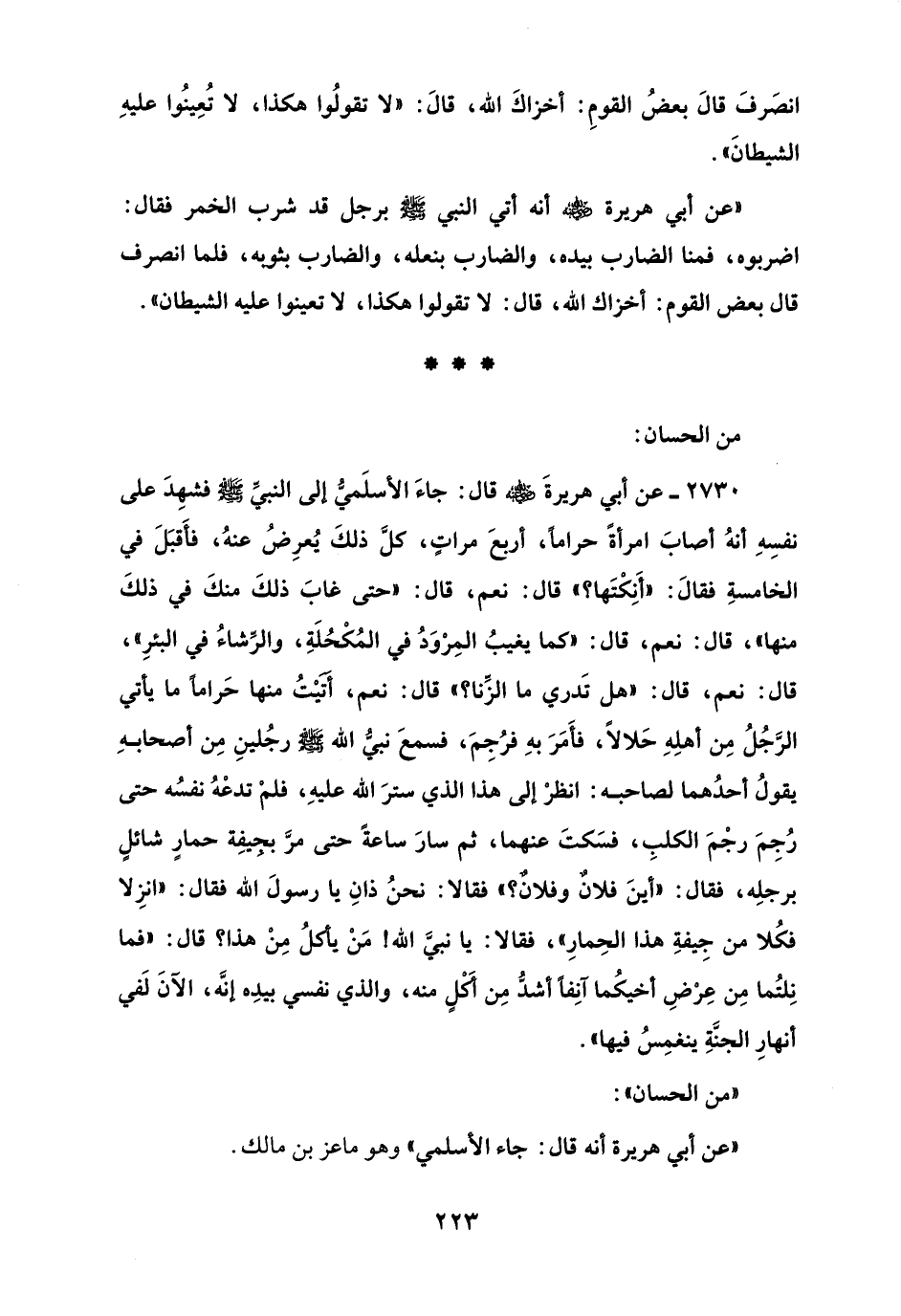 2730 - عن أبي هريرةَ - رضي الله عنه - قال: جاءَ الأسلَميُّ إلى النبيِّ - صلى الله عليه وسلم - فشهِدَ على نفسِهِ أنهُ أصابَ امرأةً حرامًا، أربعَ مراتٍ، كلَّ ذلكَ يُعرِضُ عنهُ، فأَقبَلَ في الخامسةِ فقالَ: "أَنِكْتَها؟ "، قال: نعم، قال: "حتَّى غابَ ذلكَ منكَ في ذلكَ منها" قال: نعم، قال: "كما يغيبُ المِرْوَدُ في المُكْحُلَةِ، والرِّشاءُ في البئرِ"، قال: نعم، قال: "هل تَدري ما الزِّنا؟ " قال: نعم، أتيْتُ منها حَرامًا ما يأتي الرَّجُلُ مِن أهلِهِ حَلالًا، فأَمَرَ بهِ فرُجِمَ، فسمعَ نبيُّ الله - صلى الله عليه وسلم - رجُلينِ مِن أصحابهِ يقولُ أحدُهما لصاحبه: انظرْ إلى هذا الذي سترَ الله عليهِ، فلمْ تدعْهُ نفسُه حتَّى رُجِمَ رجْمَ الكلبِ، فسَكتَ عنهما، ثم سارَ ساعةً حتَّى مرَّ بجيفِة حمارٍ شائلٍ برجلِه، فقال: "أينَ فلانٌ وفلان؟ " فقالا: نحنُ ذانِ يَا رسولَ الله فقال: "انزِلا فكُلا من جِيفةِ هذا الحِمارِ"، فقالا: يَا نبيَّ الله! مَنْ يأكلُ مِنْ هذا؟ قال: "فما نِلتُما مِن عِرْضِ أخيكُما آنِفًا أشدُّ مِن أكلٍ منه، والذي نفسي بيدِه إنَّه، الآنَ لَفي أنهارِ الجنَّةِ ينغمِسُ فيها".