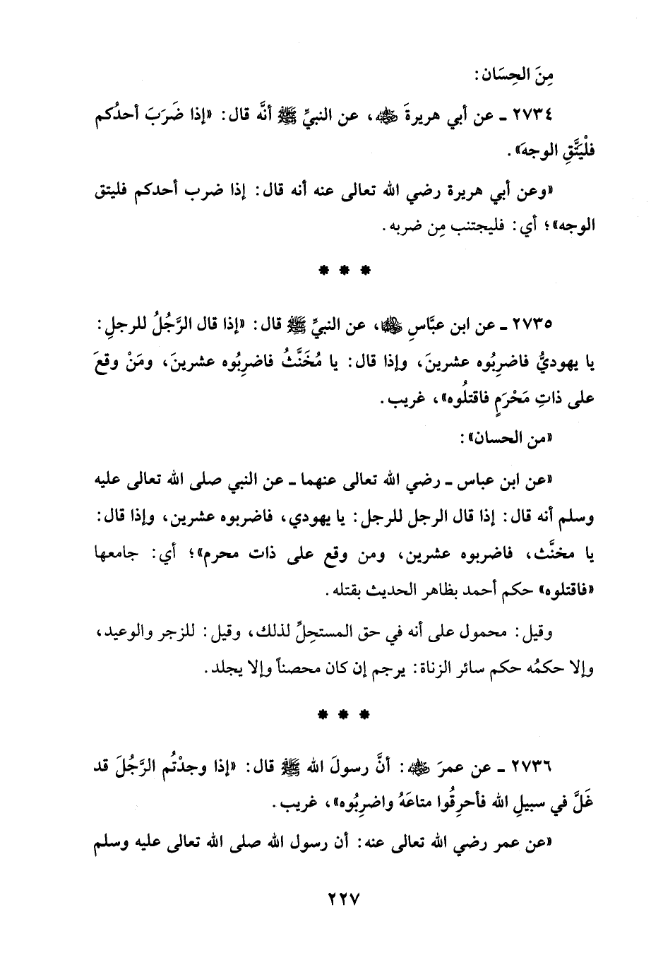 2735 - عن ابن عبَّاسِ - رضي الله عنهما -، عن النبيِّ - صلى الله عليه وسلم - قال: "إذا قال الرَّجُلُ للرجلِ: يَا يهوديُّ فاضرِبُوه عشرينَ، وإذا قال: يَا مُخَنَّثُ فاضرِبُوه عشرينَ، ومَنْ وقعَ على ذاتِ مَحْرَمٍ فاقتلُوه"، غريب.