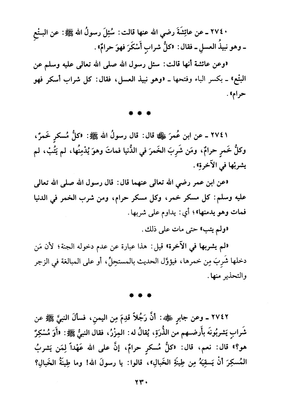 2740 - عن عائِشَةَ رضي الله عنها قالت: سُئِلَ رسولُ الله - صلى الله عليه وسلم -: عن البتْعِ - وهو نبيذُ العسلِ - فقال: "كلُّ شرابٍ أَسْكَرَ فهوَ حرامٌ".