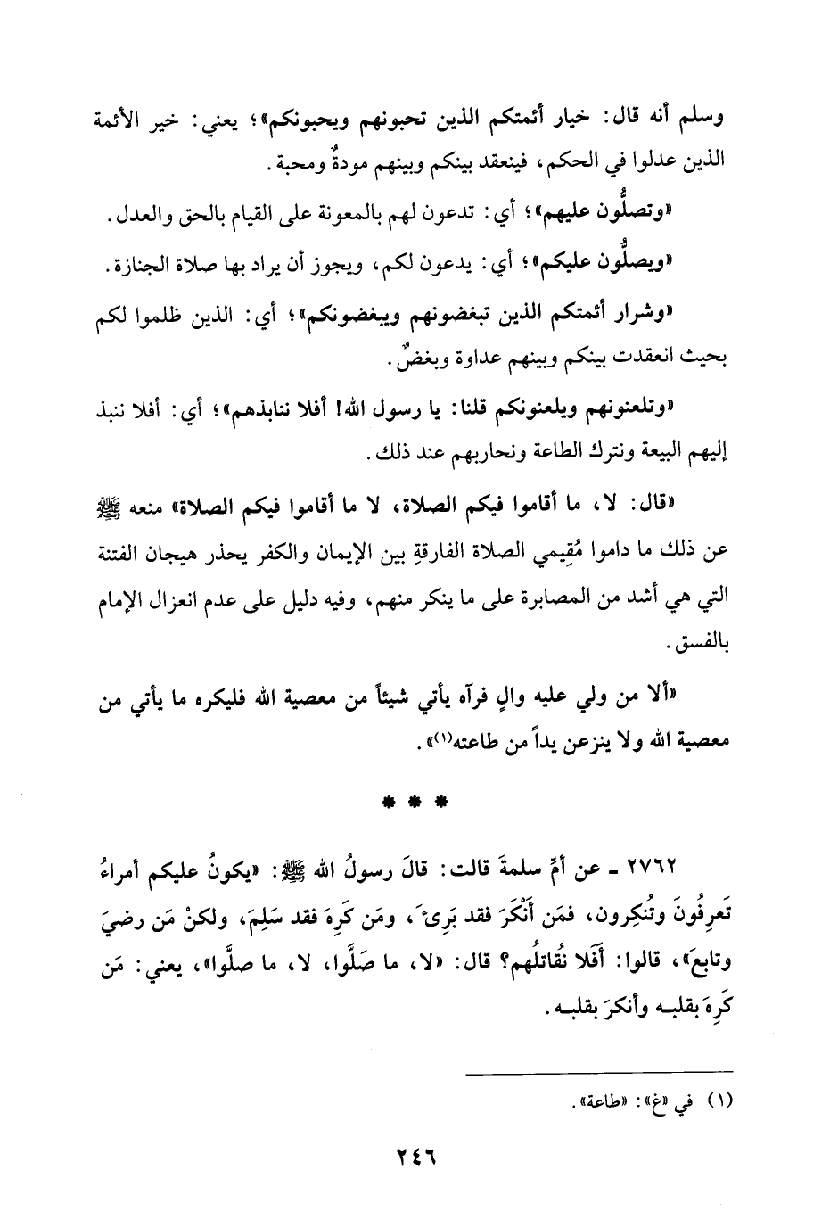 2762 - عن أمِّ سلمةَ قالت: قالَ رسولُ الله - صلى الله عليه وسلم -: "يكونُ عليكم أمراءُ تَعرِفُونَ وتُنكِرون، فمَن أَنْكَرَ فقد بَرِئَ، ومَن كَرِهَ فقد سَلِمَ، ولكنْ مَن رضيَ وتابعَ"، قالوا: أفلا نقُاتلُهم؟ قال: "لا، ما صَلَّوا، لا، ما صلَّوا"، يعني: مَن كَرِهَ بقلبه وأنكرَ بقلبه.