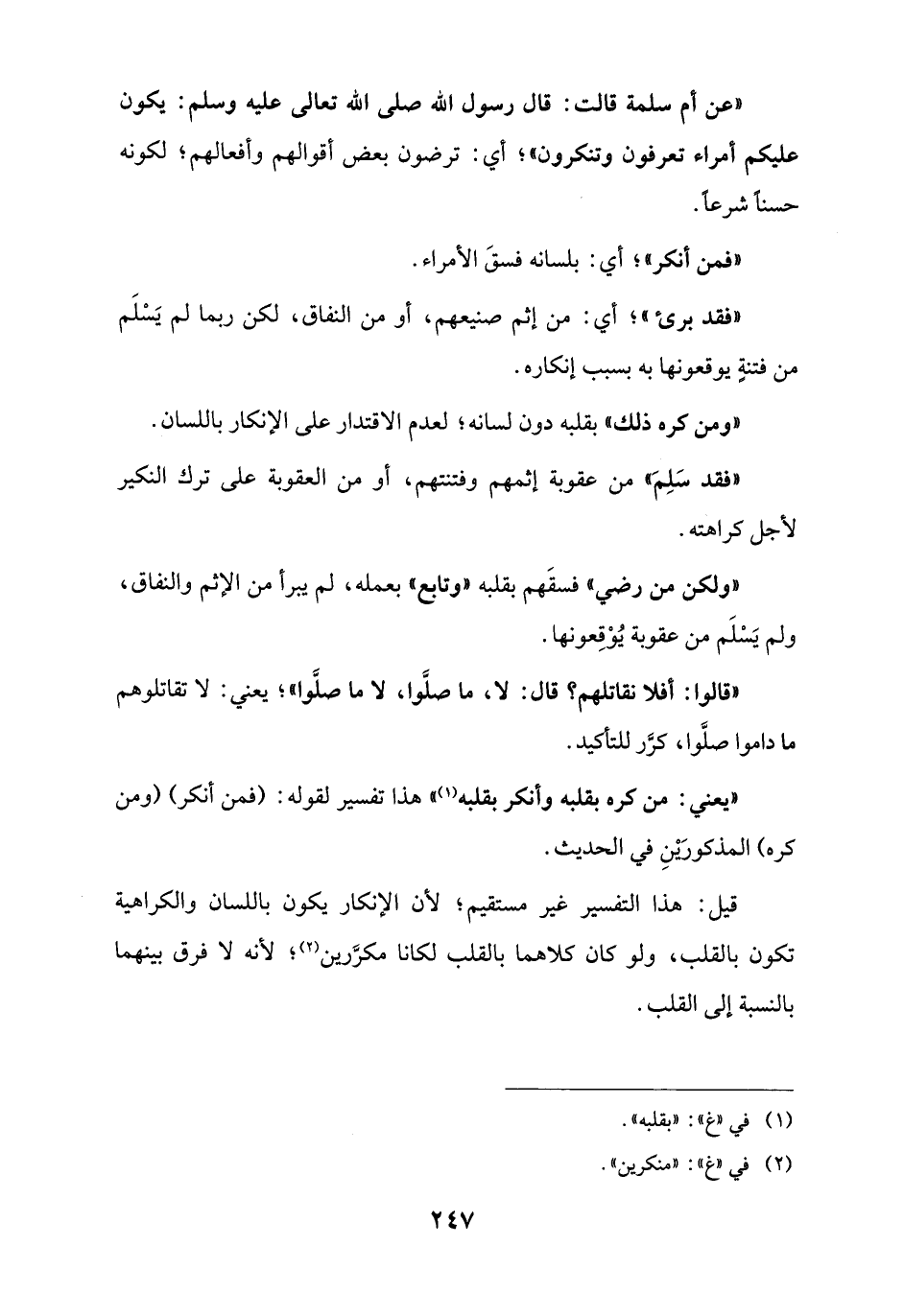 قيل: هذا التفسير غير مستقيم؛ لأن الإنكار يكون باللسان والكراهية تكون بالقلب، ولو كان كلاهما بالقلب لكانا مكرَّرين (¬2)؛ لأنه لا فرق بينهما بالنسبة إلى القلب.