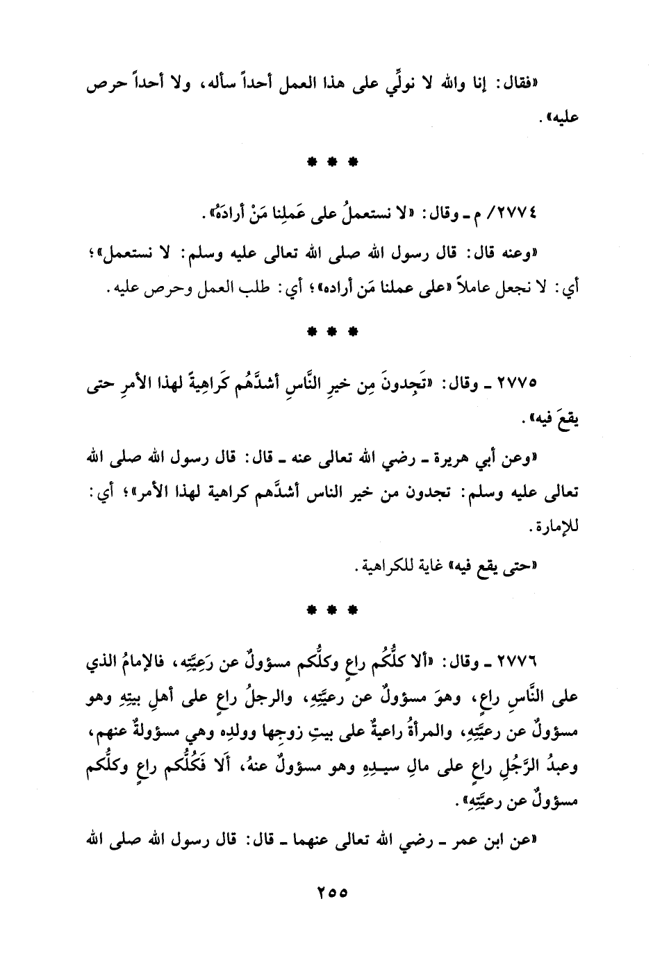 2776 - وقال: "ألا كلُّكُم راعٍ وكلُّكم مسؤولٌ عن رَعيَّتِه، فالإمامُ الذي على النَّاسِ راعٍ، وهوَ مسؤولٌ عن رعيَّتِهِ، والرجلُ راعٍ على أهلِ بيتِهِ وهو مسؤولٌ عن رعيَّتِهِ، والمرأةُ راعيةٌ على بيتِ زوجها وولدِه وهي مسؤولةٌ عنهم، وعبدُ الرَّجُلِ راعٍ على مالِ سيدِهِ وهو مسؤولٌ عنهُ، أَلا فَكُلُّكم راعٍ وكلُّكم مسؤولٌ عن رعيَّتِهِ".